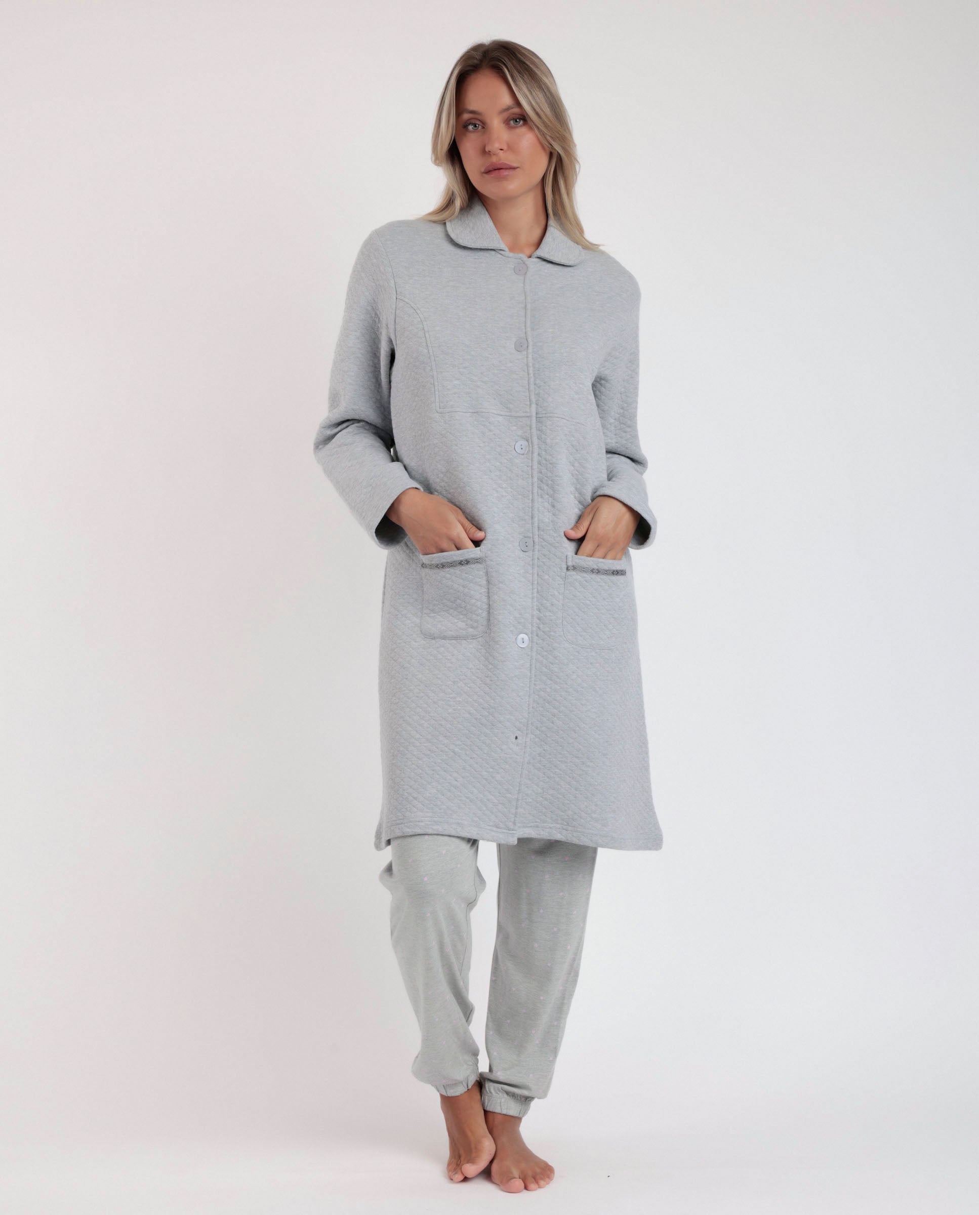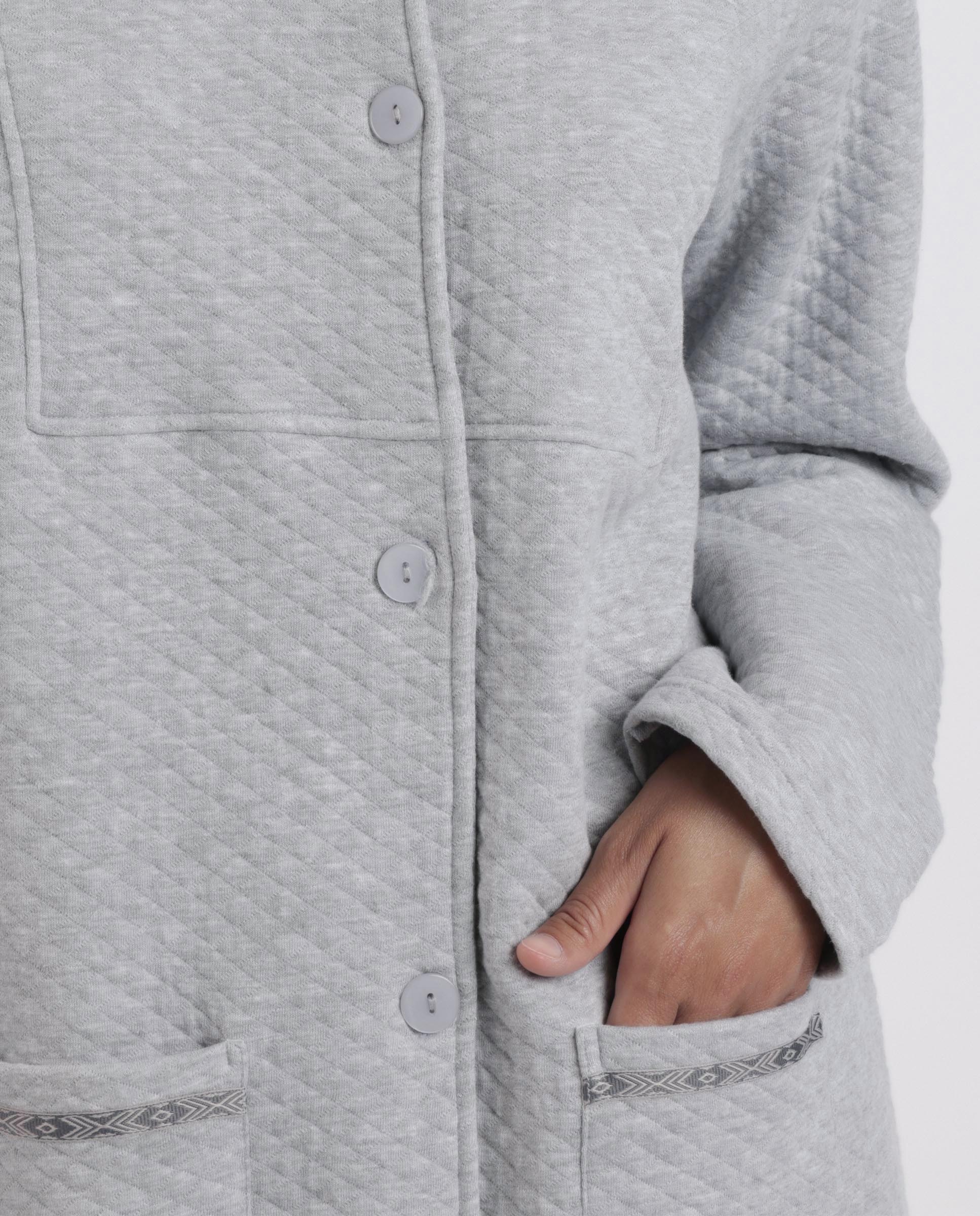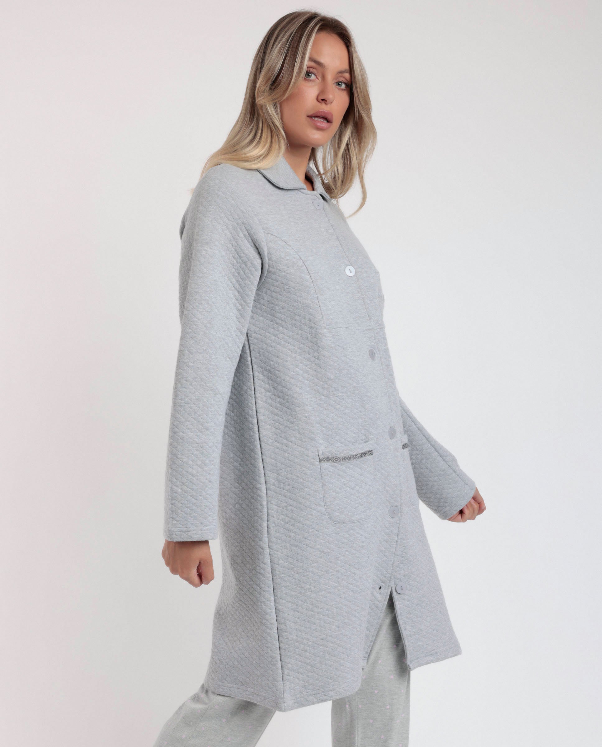 * Bata de punto acolchado con botones, de color gris jaspe, con detalles en glitter, personalizada de la marca Admas Classic.