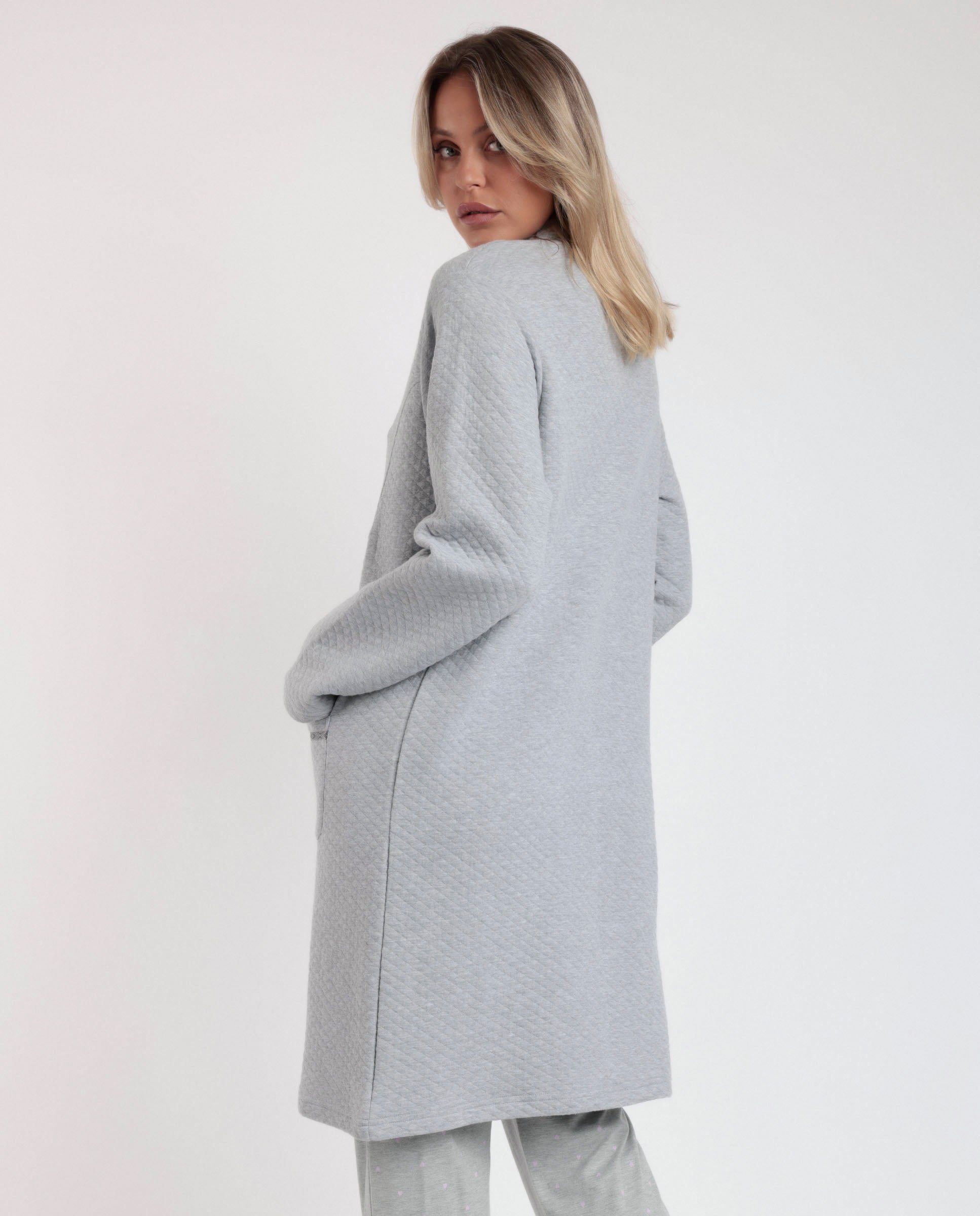 * Bata de punto de algodón, de tejido especial guateado, de manga larga, con bolsillos.