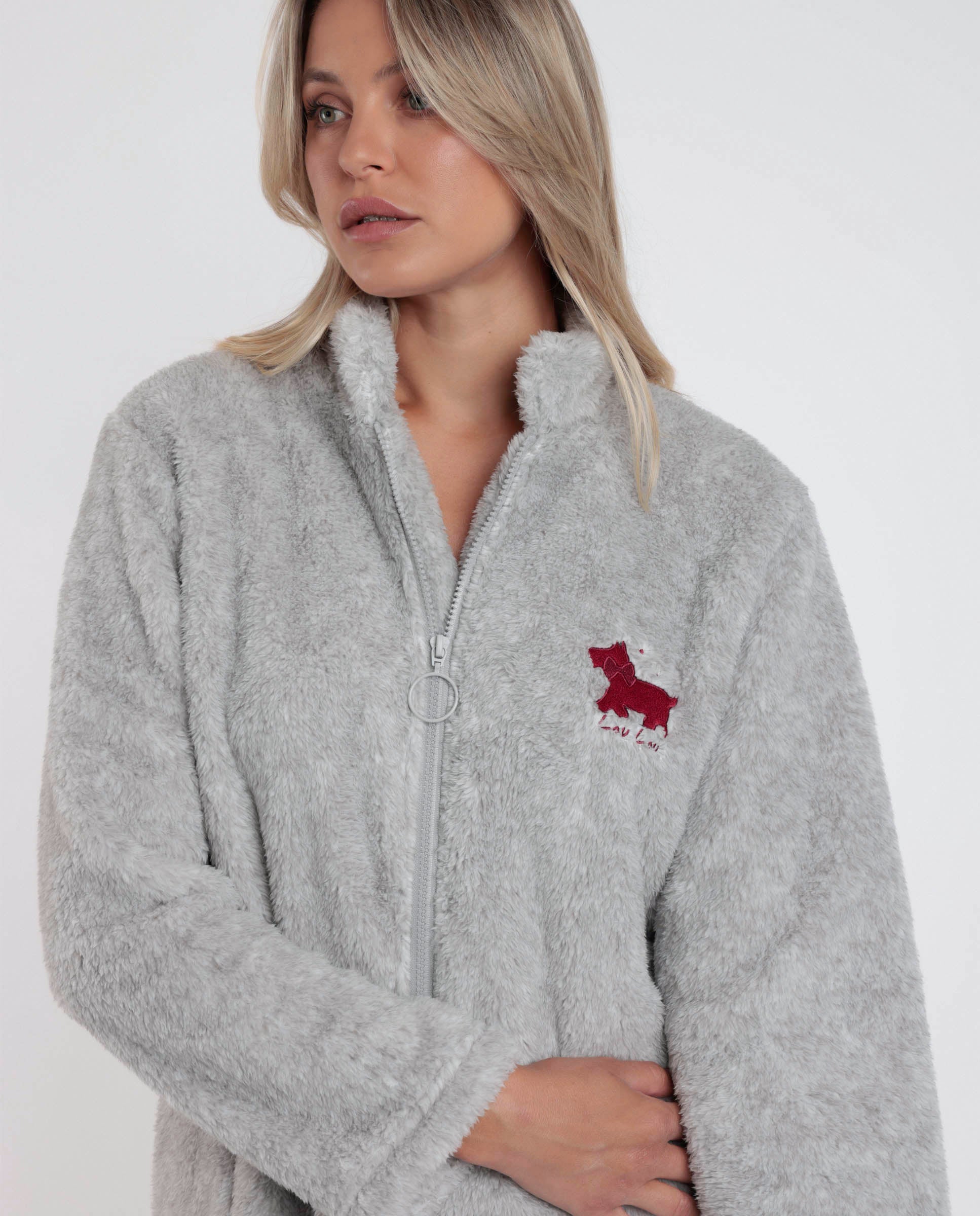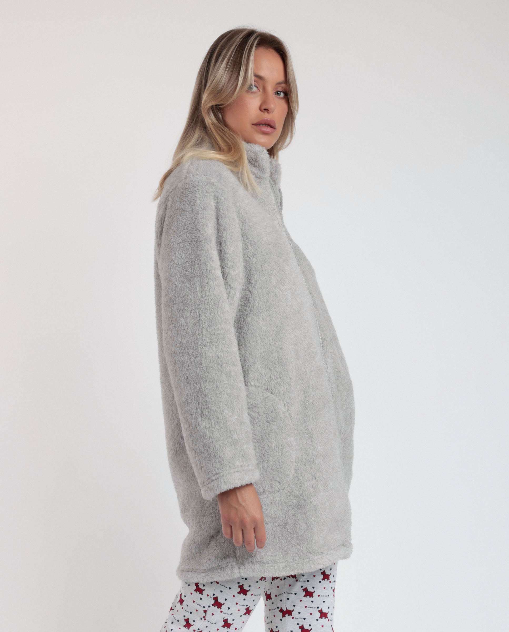 * Bata larga, de tejido especial corel muy calentito, con bolsillos y detalles bordados, en color gris jaspe.