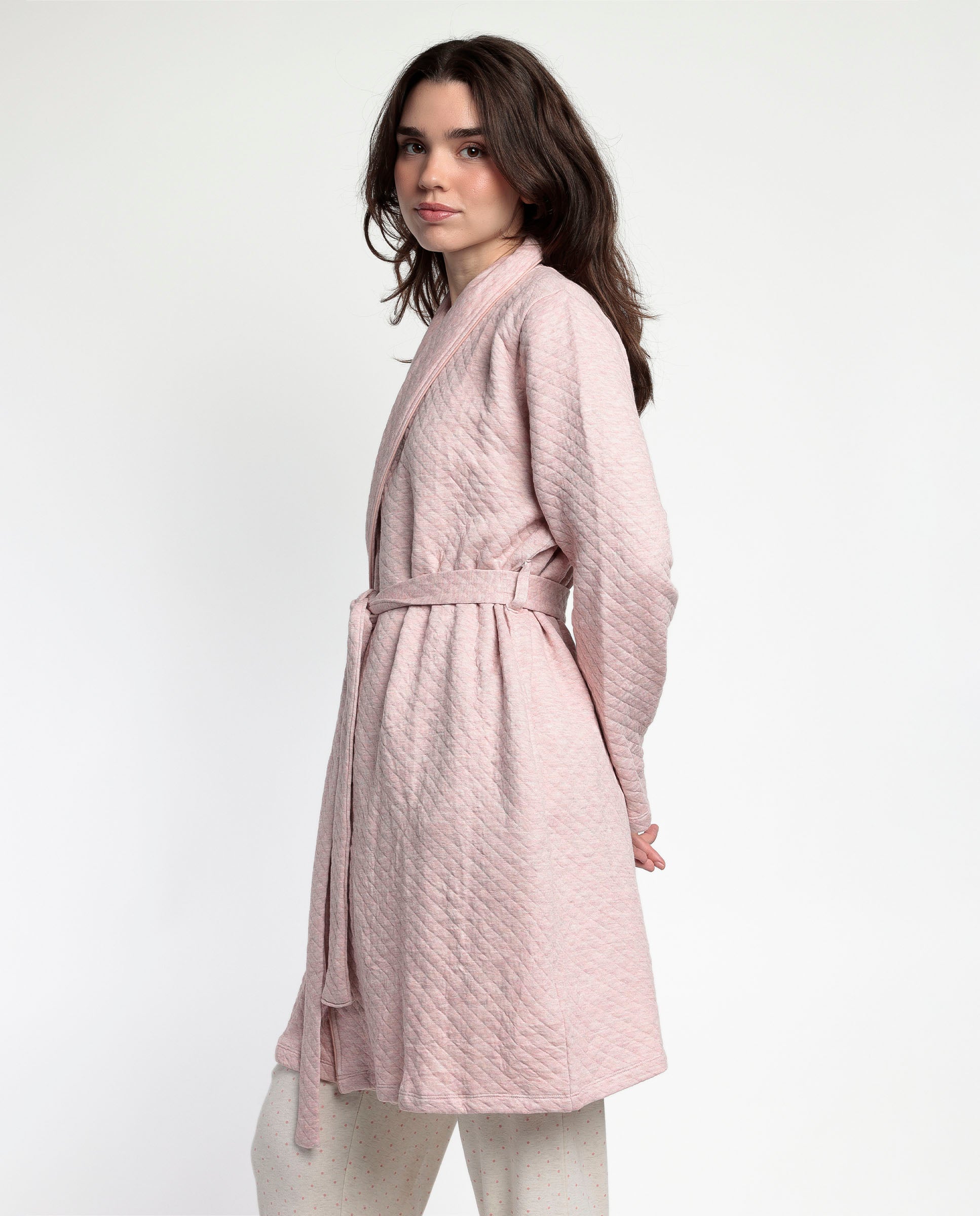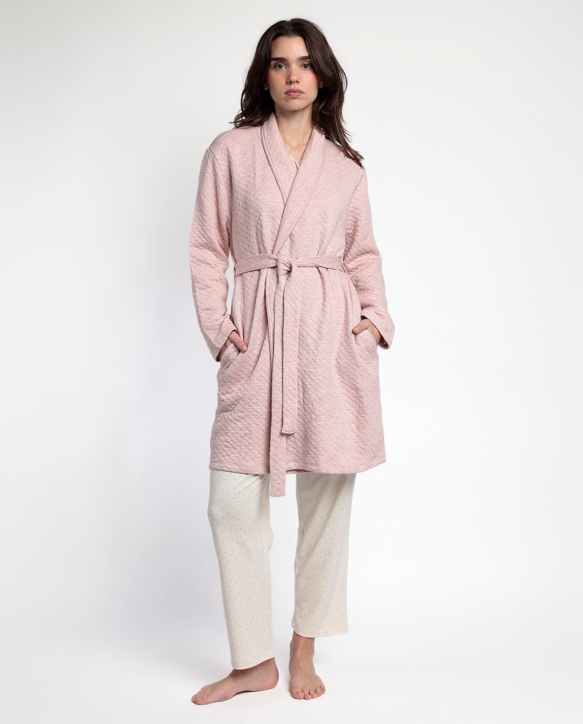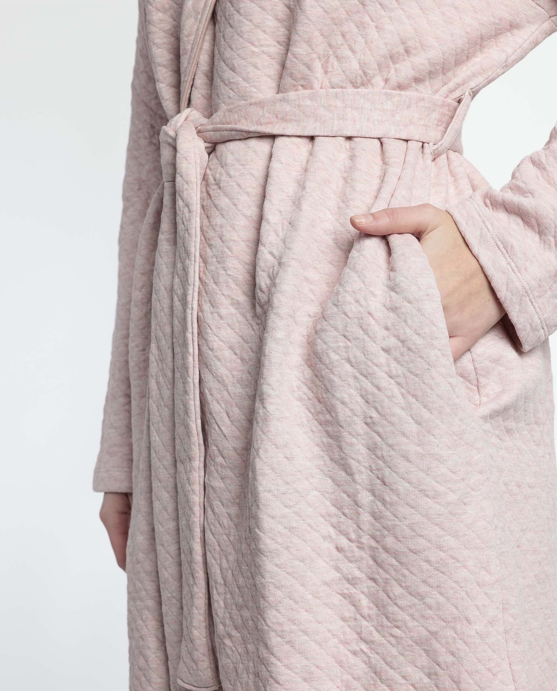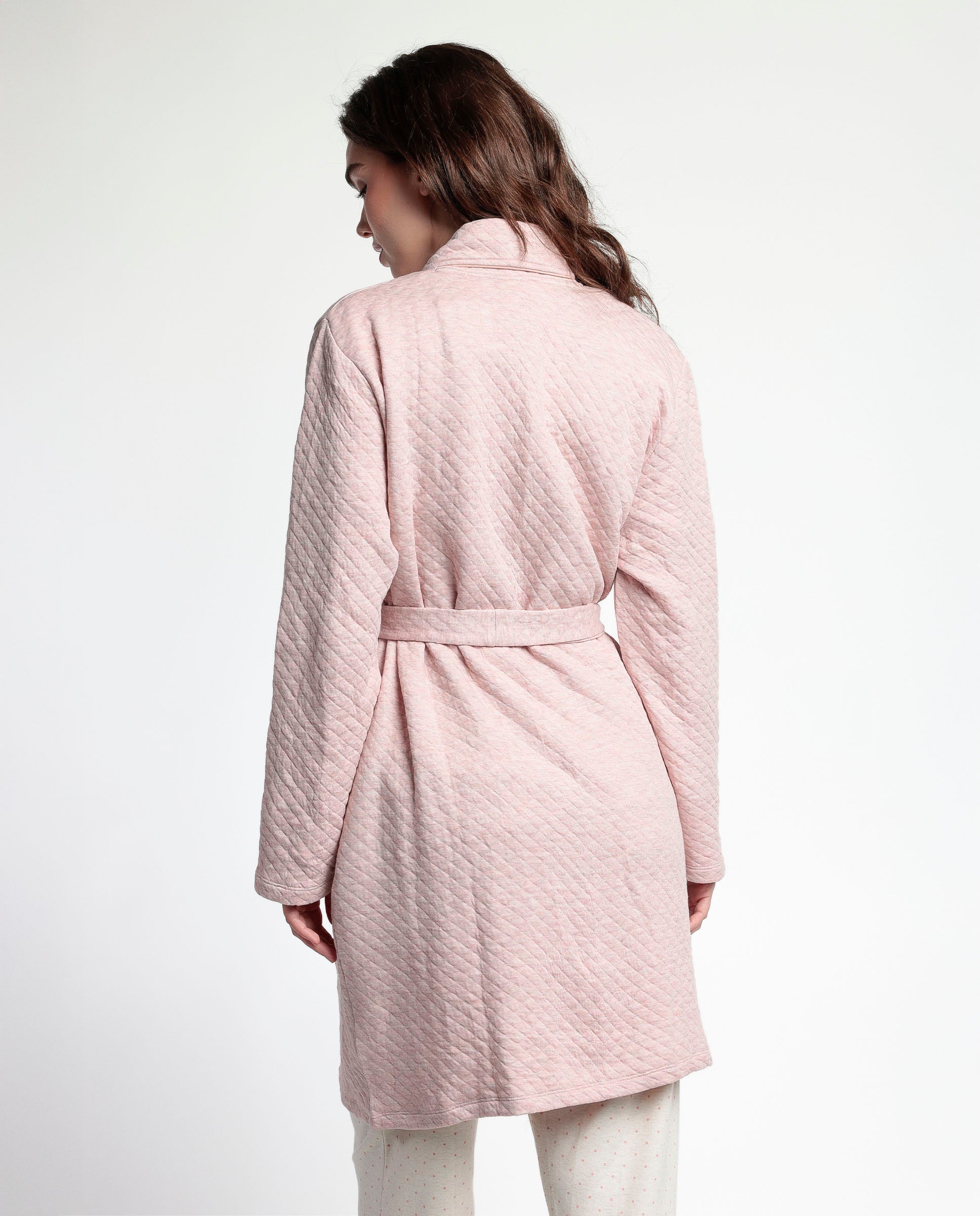 * Bata de punto acolchado interlock, de manga larga, en color coral.