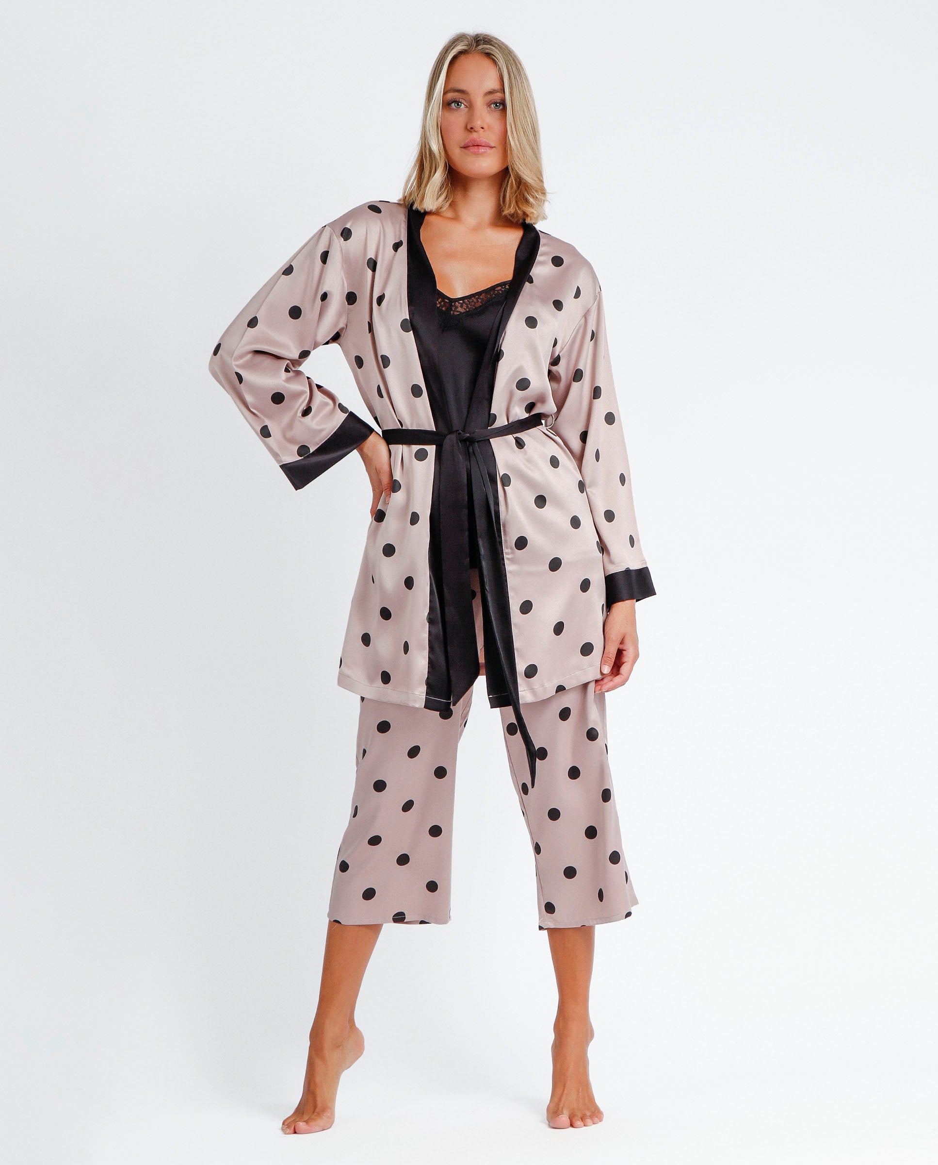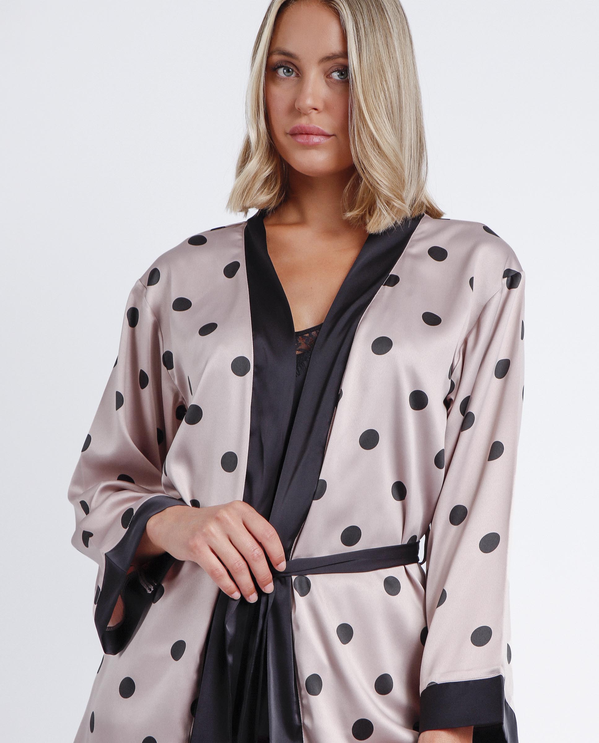 * Bata de tela satén, con diseño de topos, de manga larga, en dos combinaciones de color: negro y burdeos.