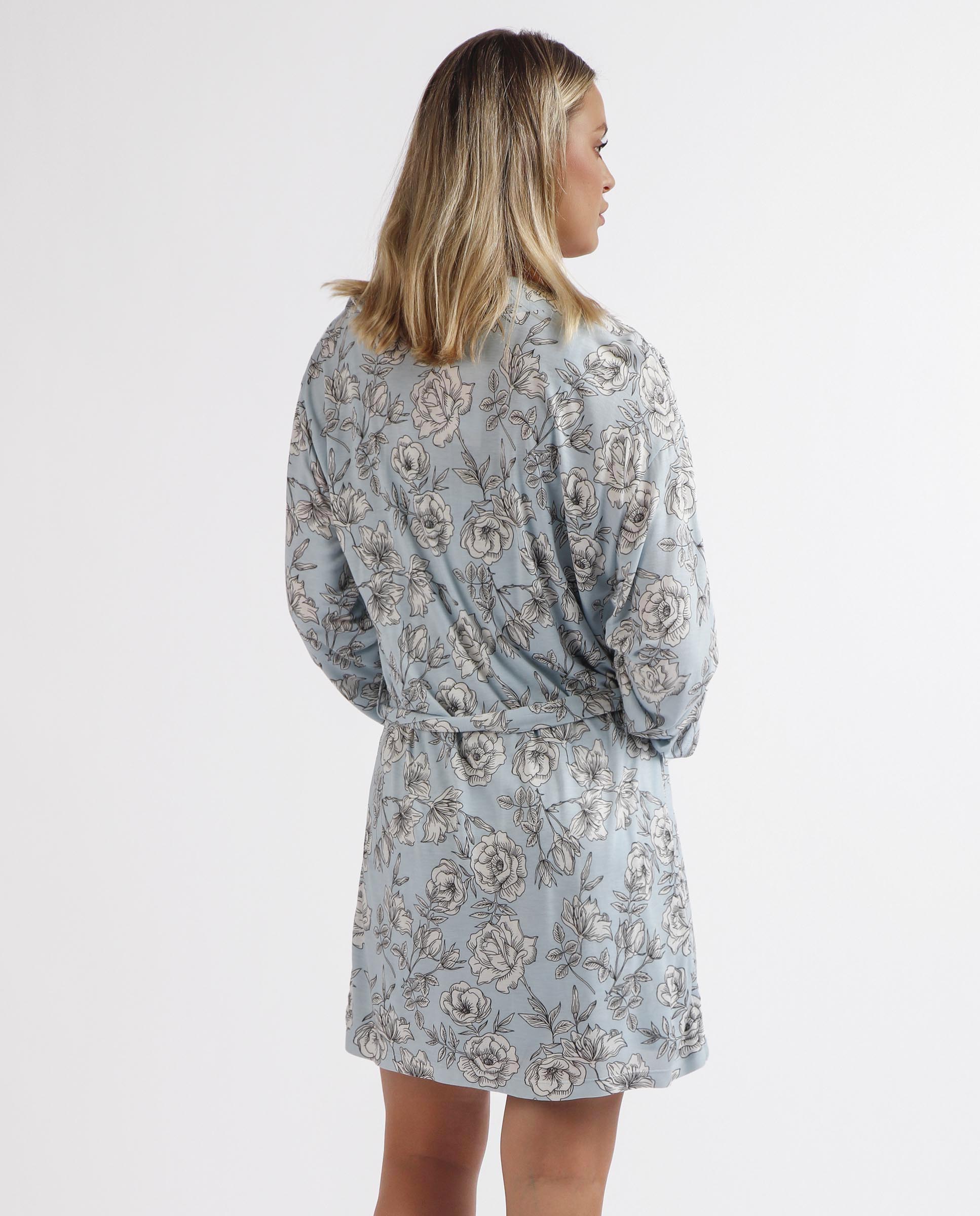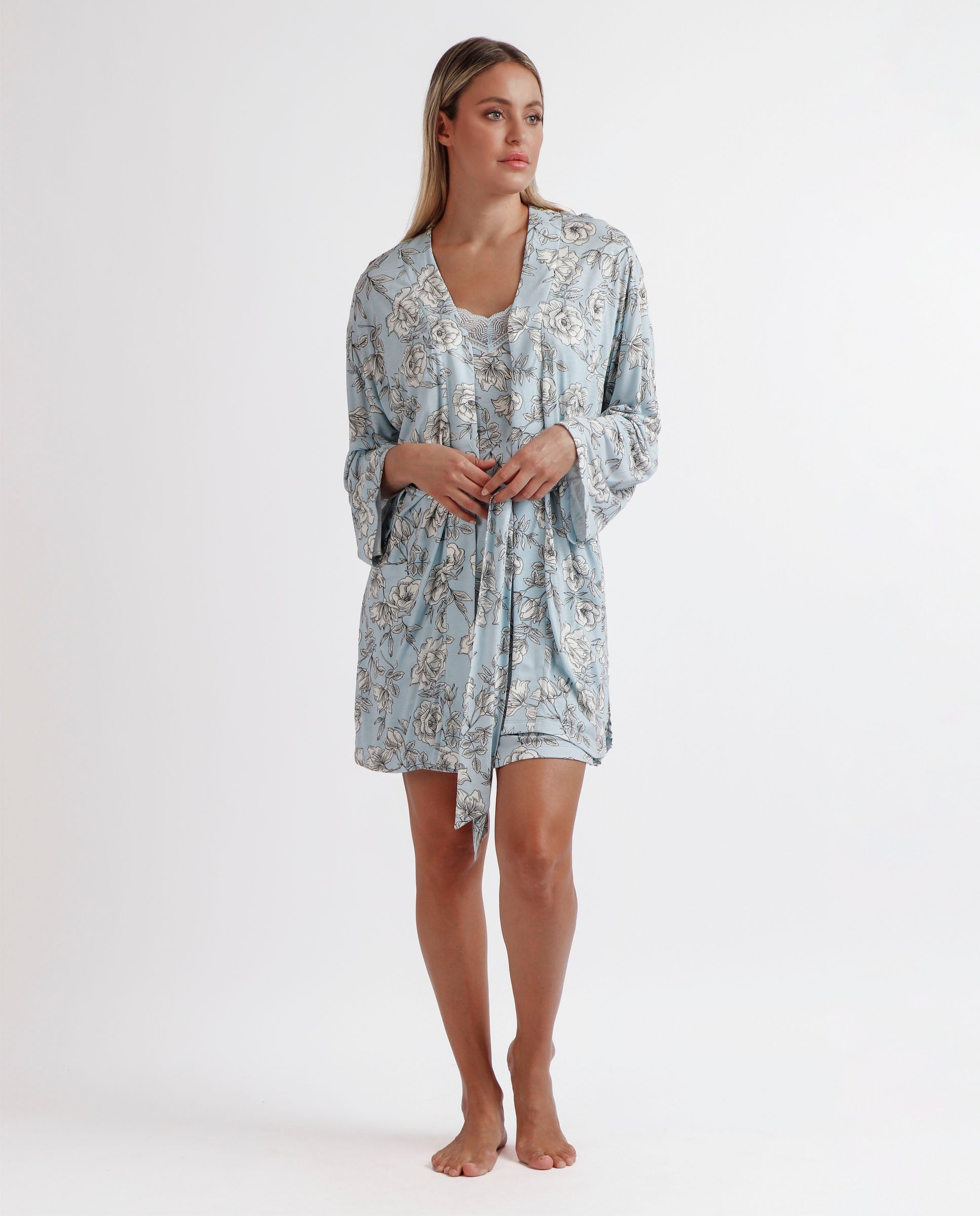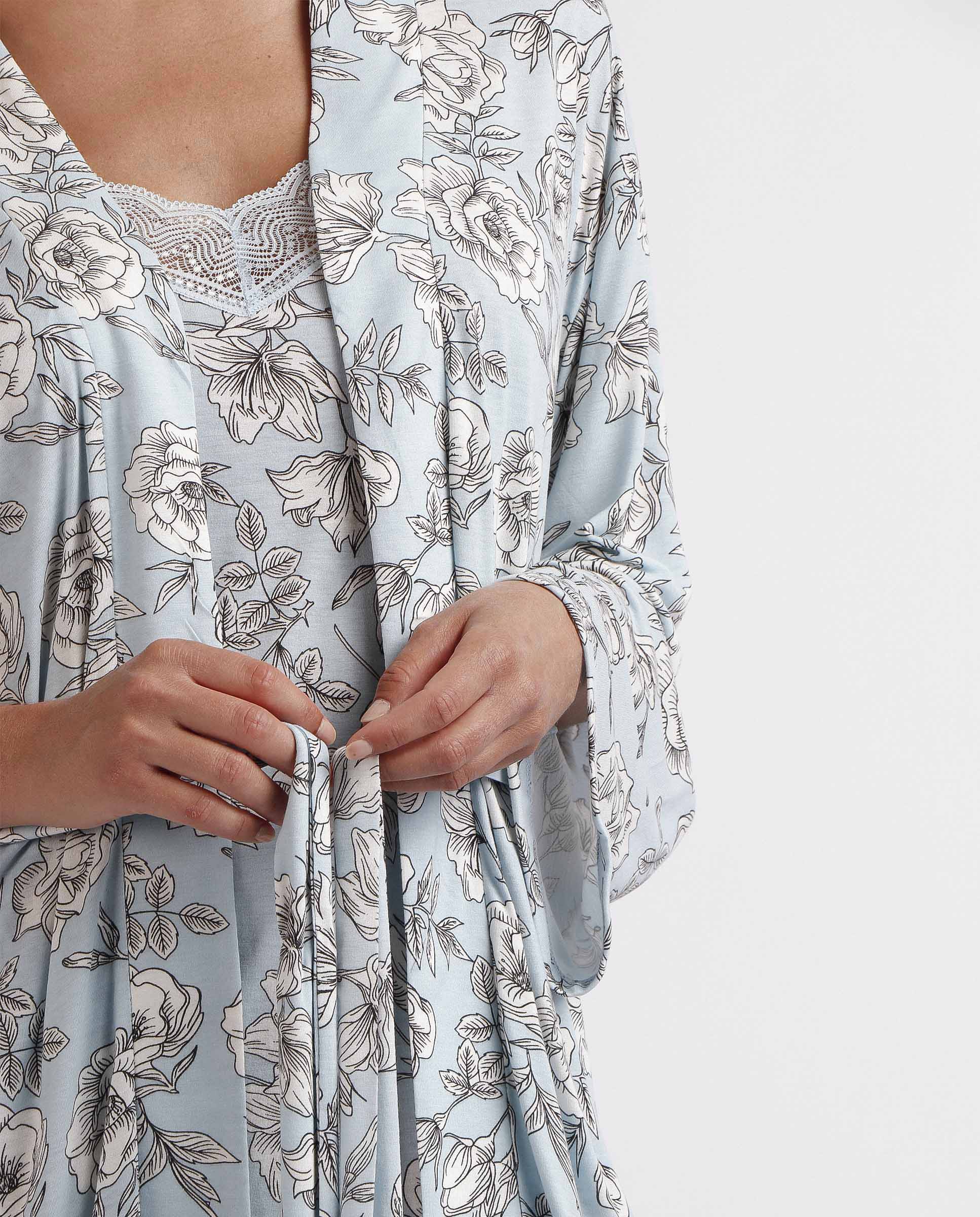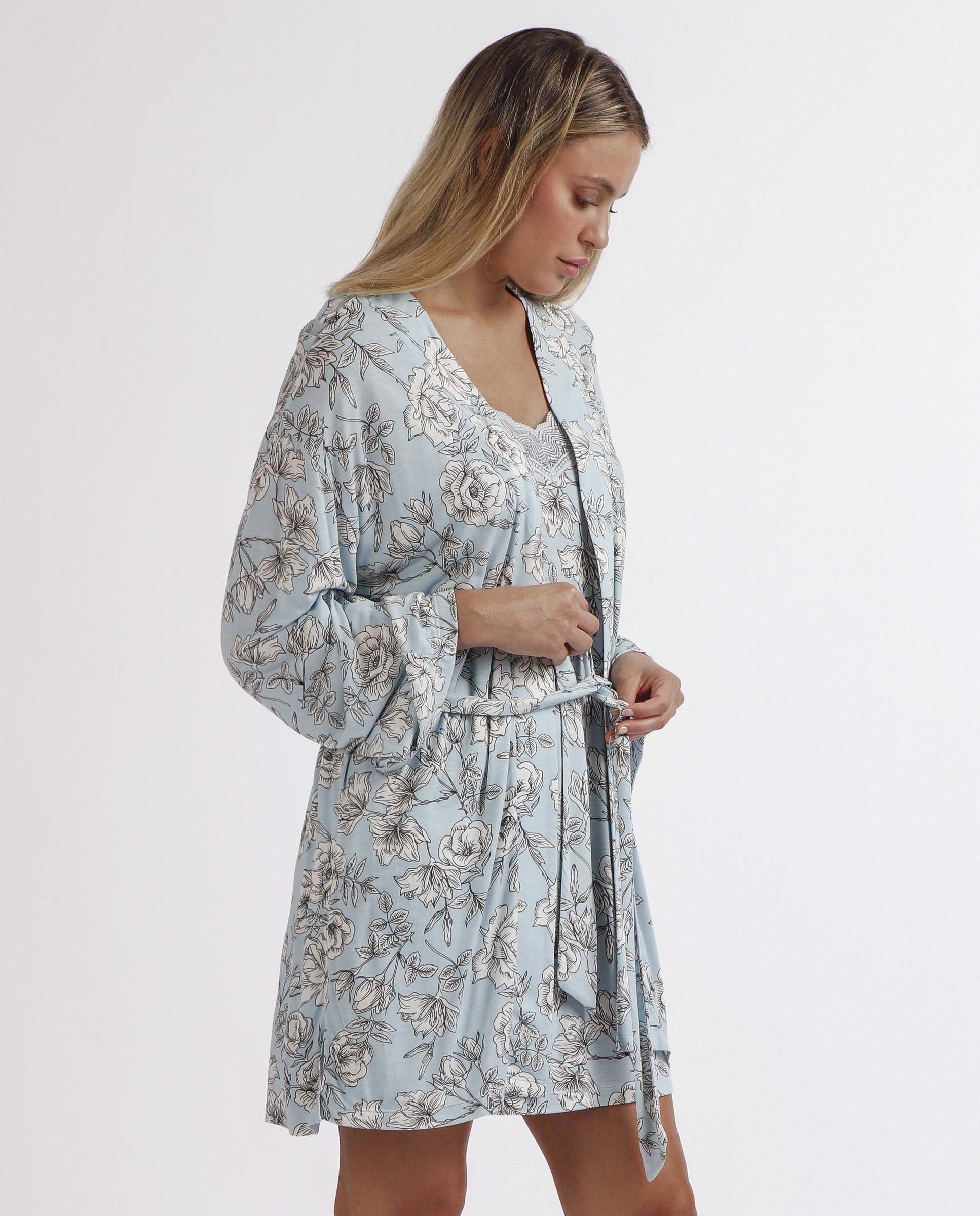 * Bata de punto estampado, de manga larga, en dos combinaciones de color: hielo y pétalo.