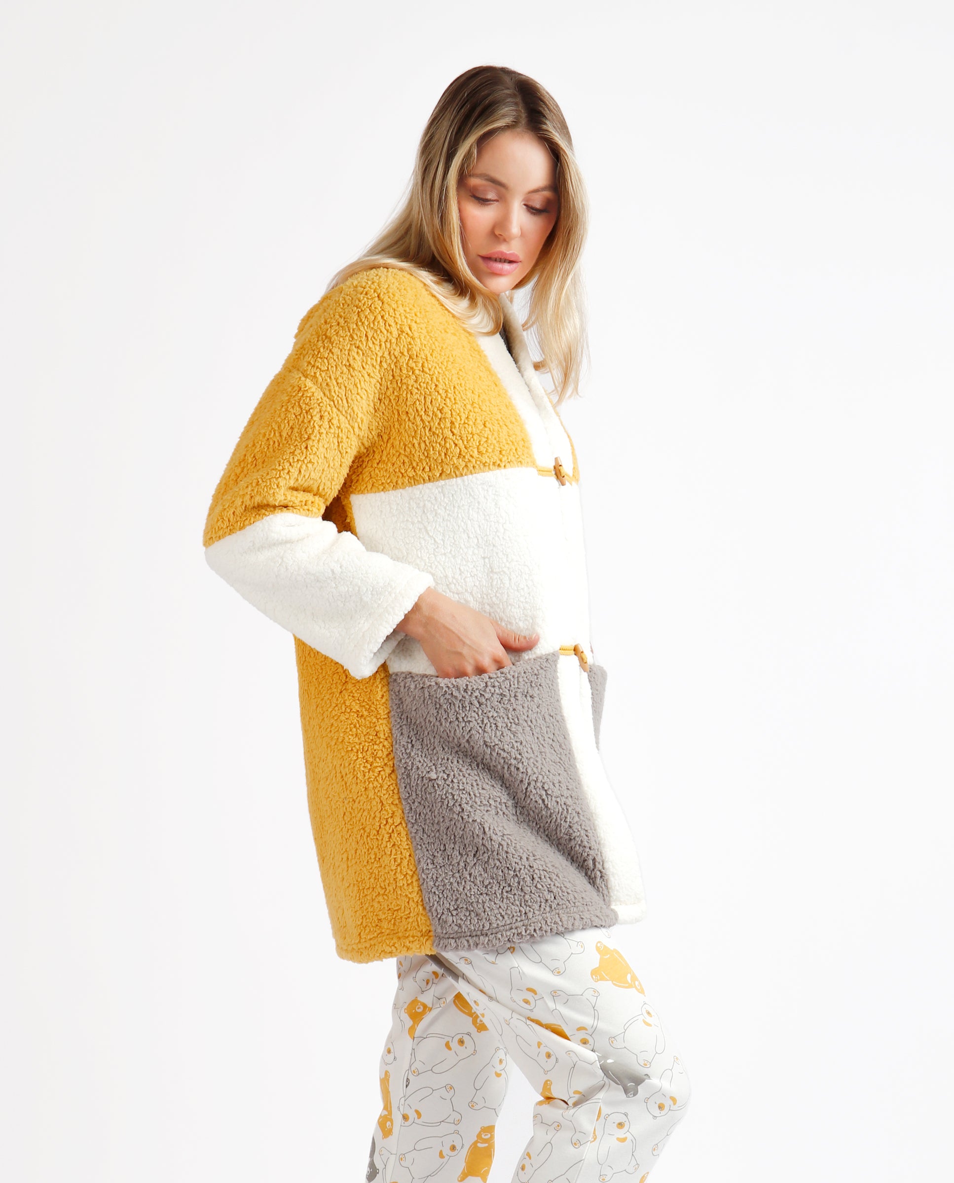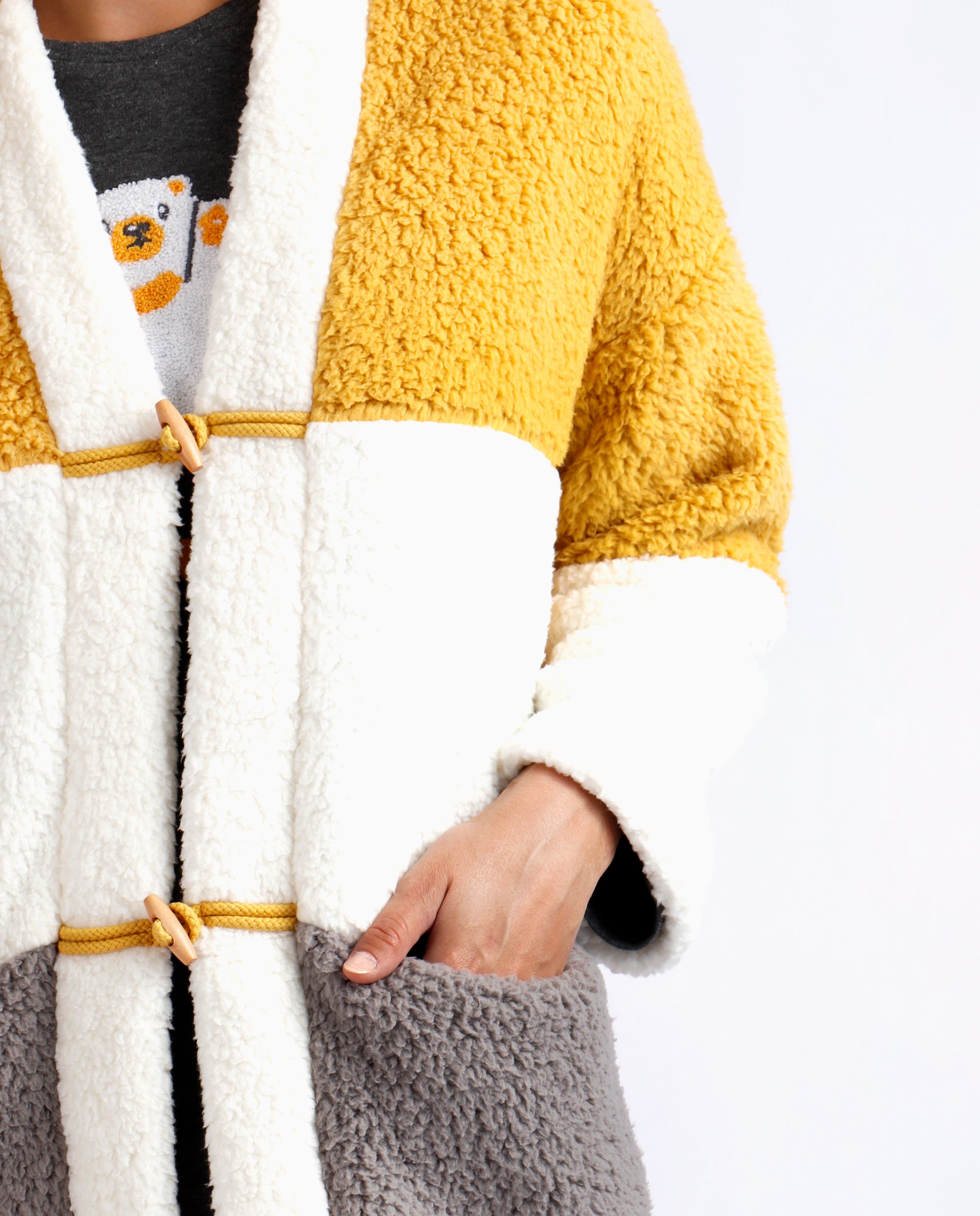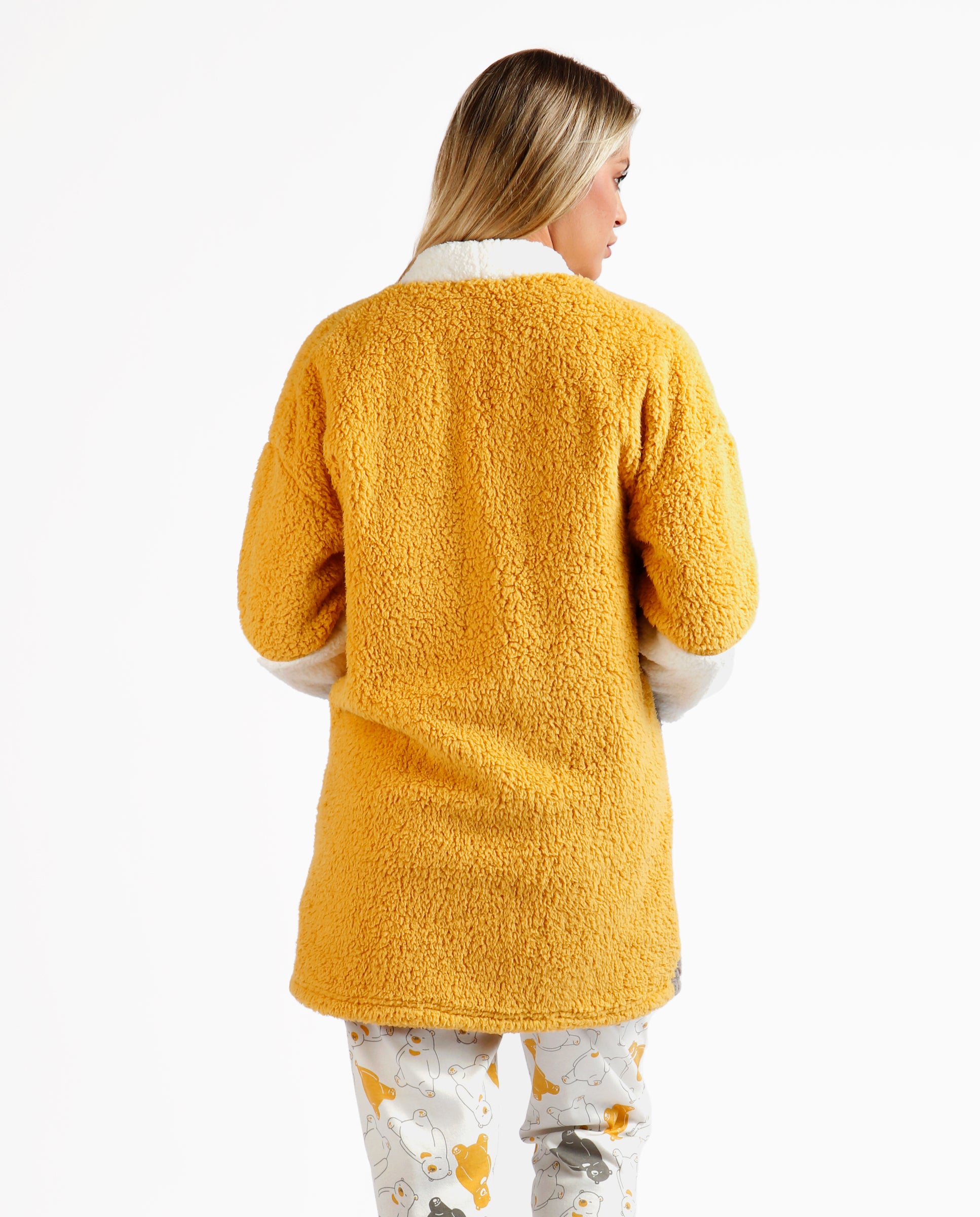 * Bata parches de tejido especial borreguito muy calentito, de color mostaza.