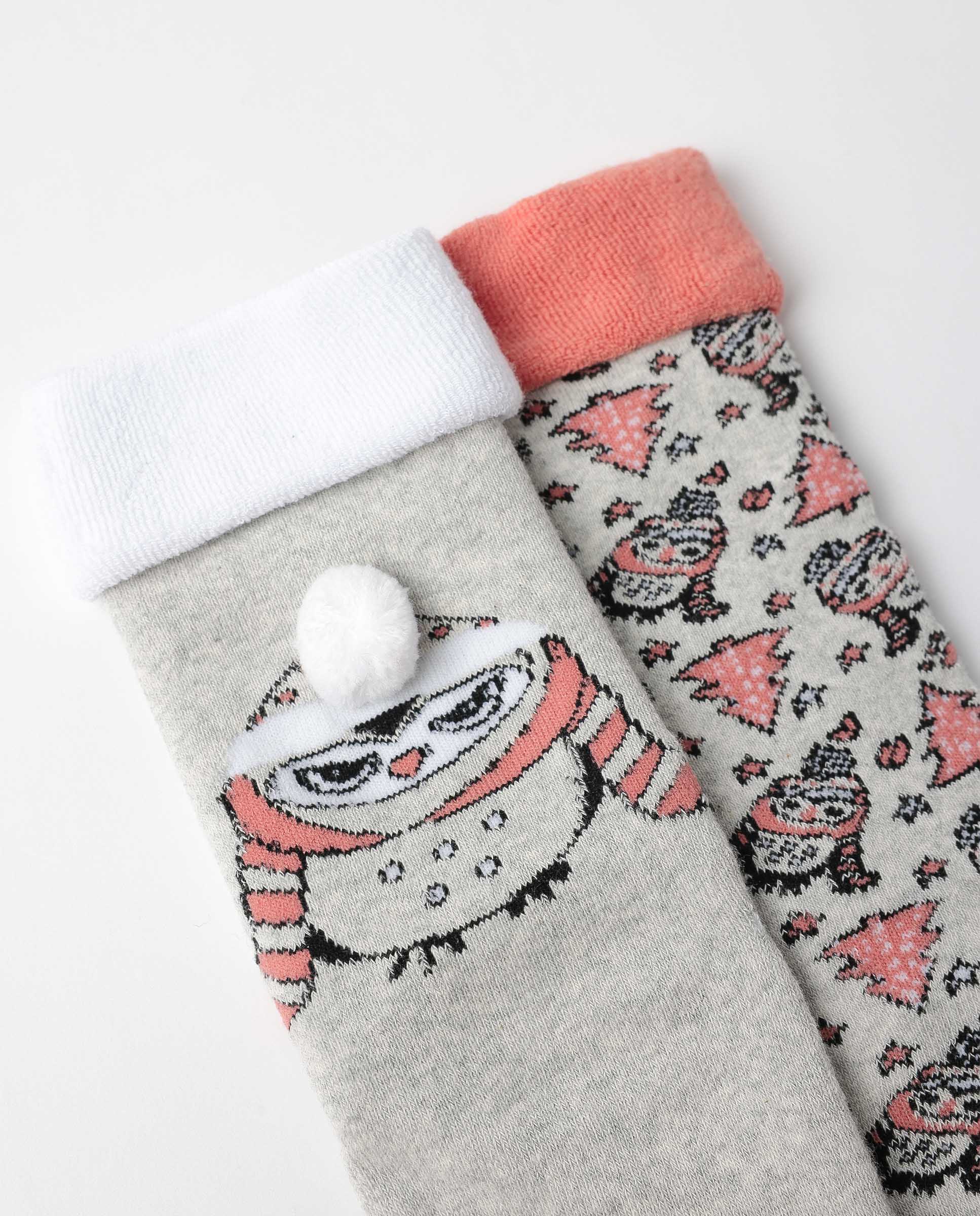 * Calcetín de largo medio antideslizante de rizo, de punto de algodón, en dos combinaciones de diseño y color: gris jaspe y coral.