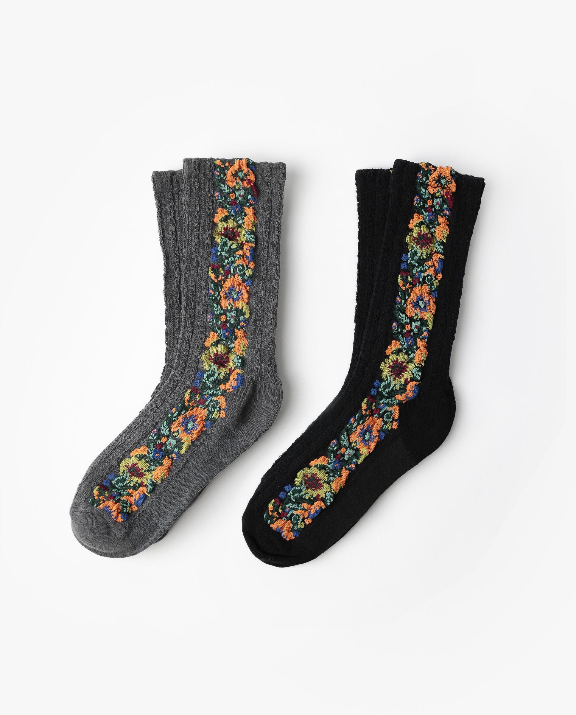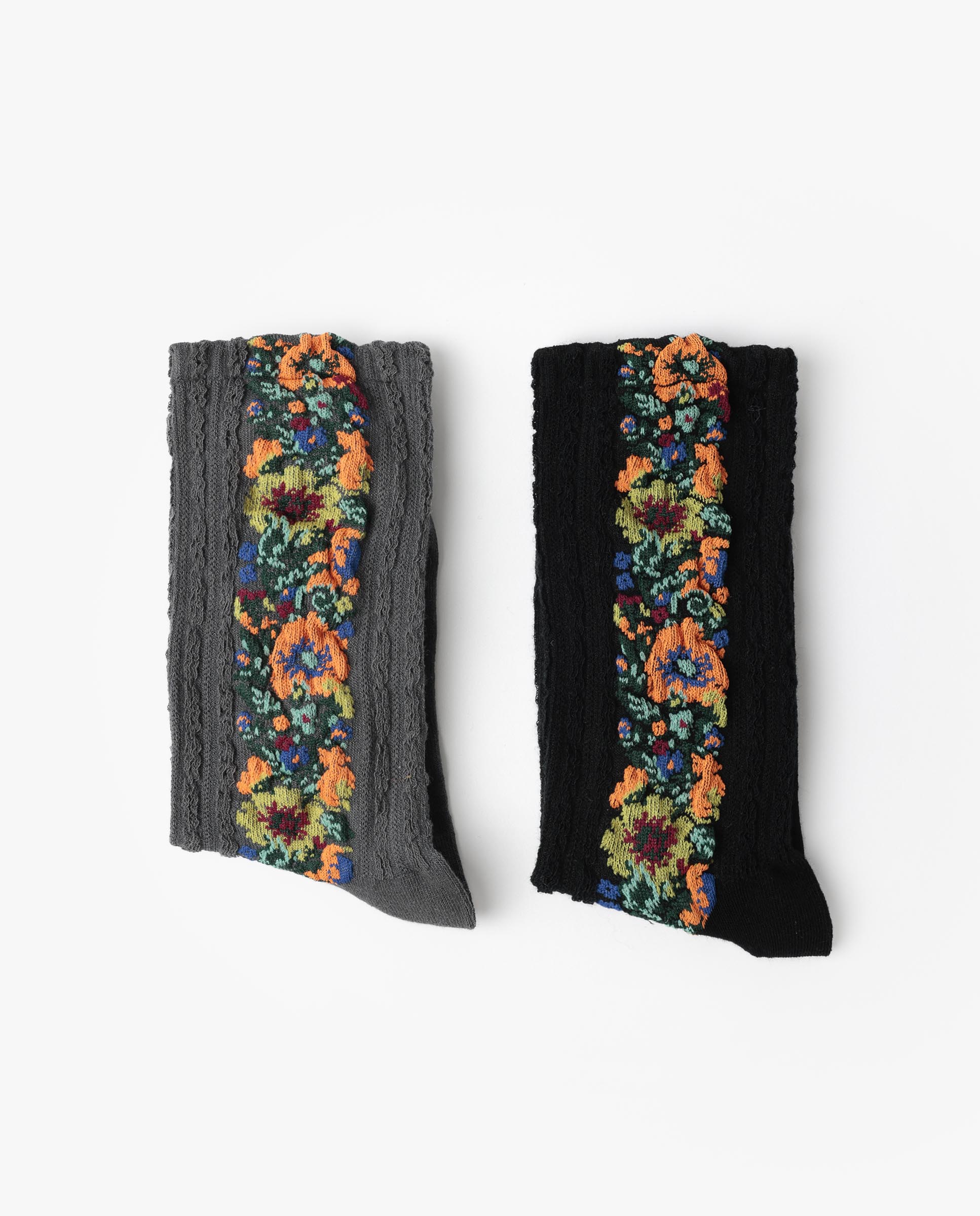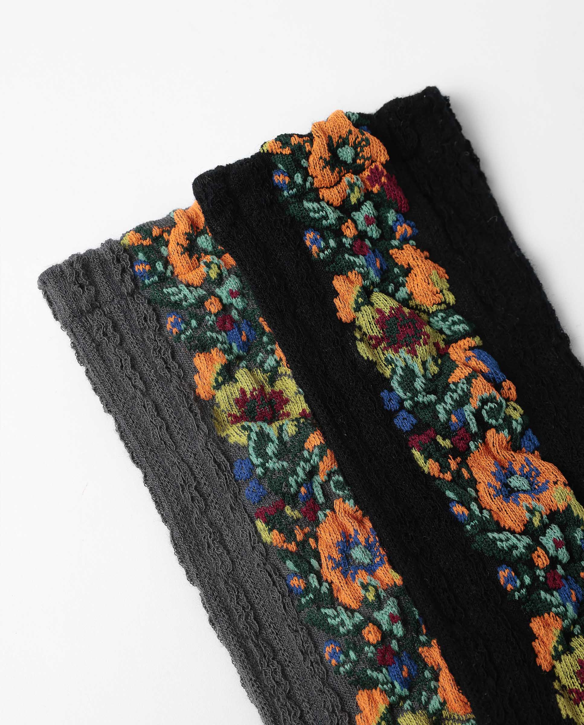 * Calcetín de largo medio, de punto de algodón, con diseño floral, en dos combinaciones de color: gris y negro.