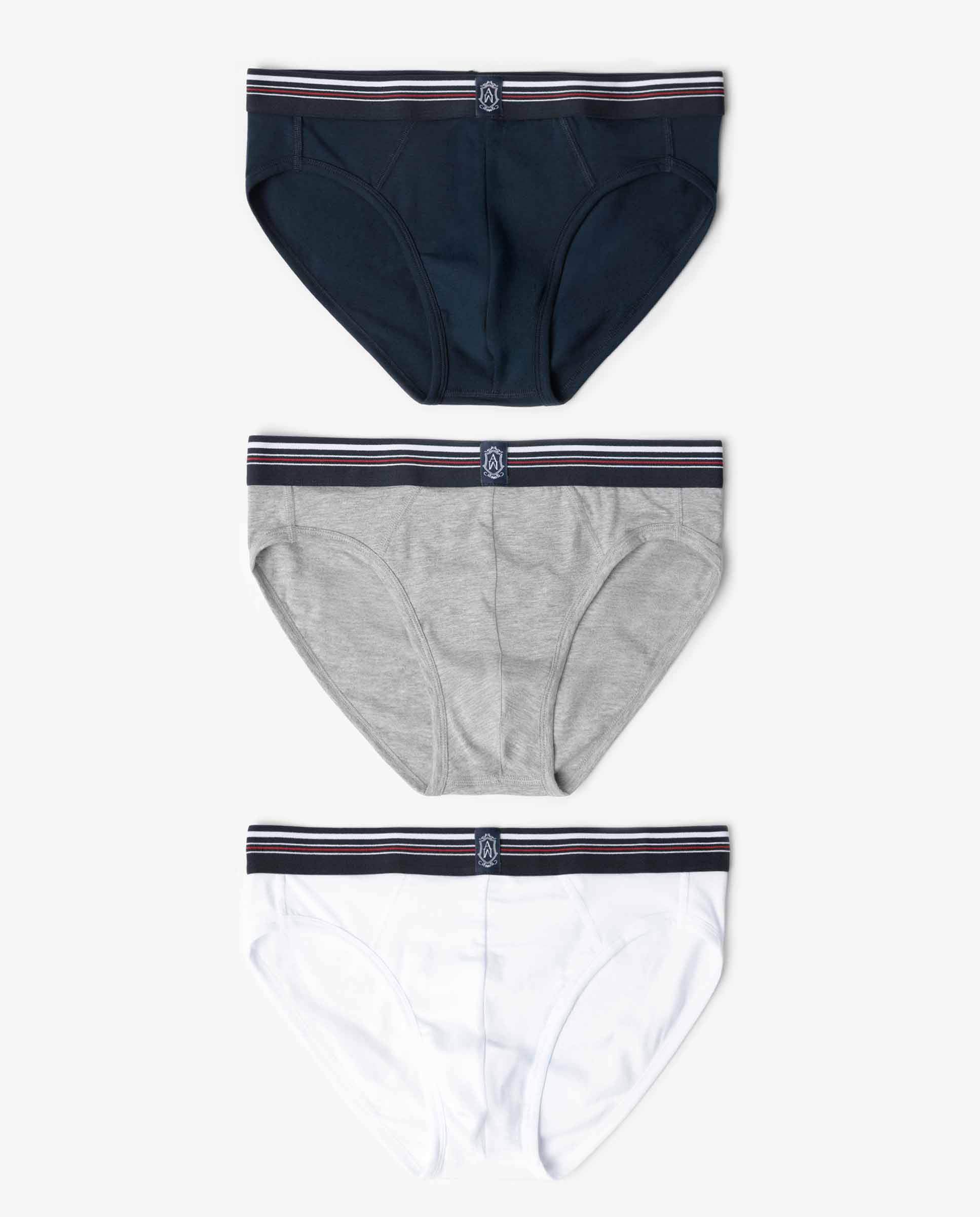 * Calzoncillo/Slip para hombre, de algodón elástico, en tres combinaciones de color: blanco, gris jaspe y marino.