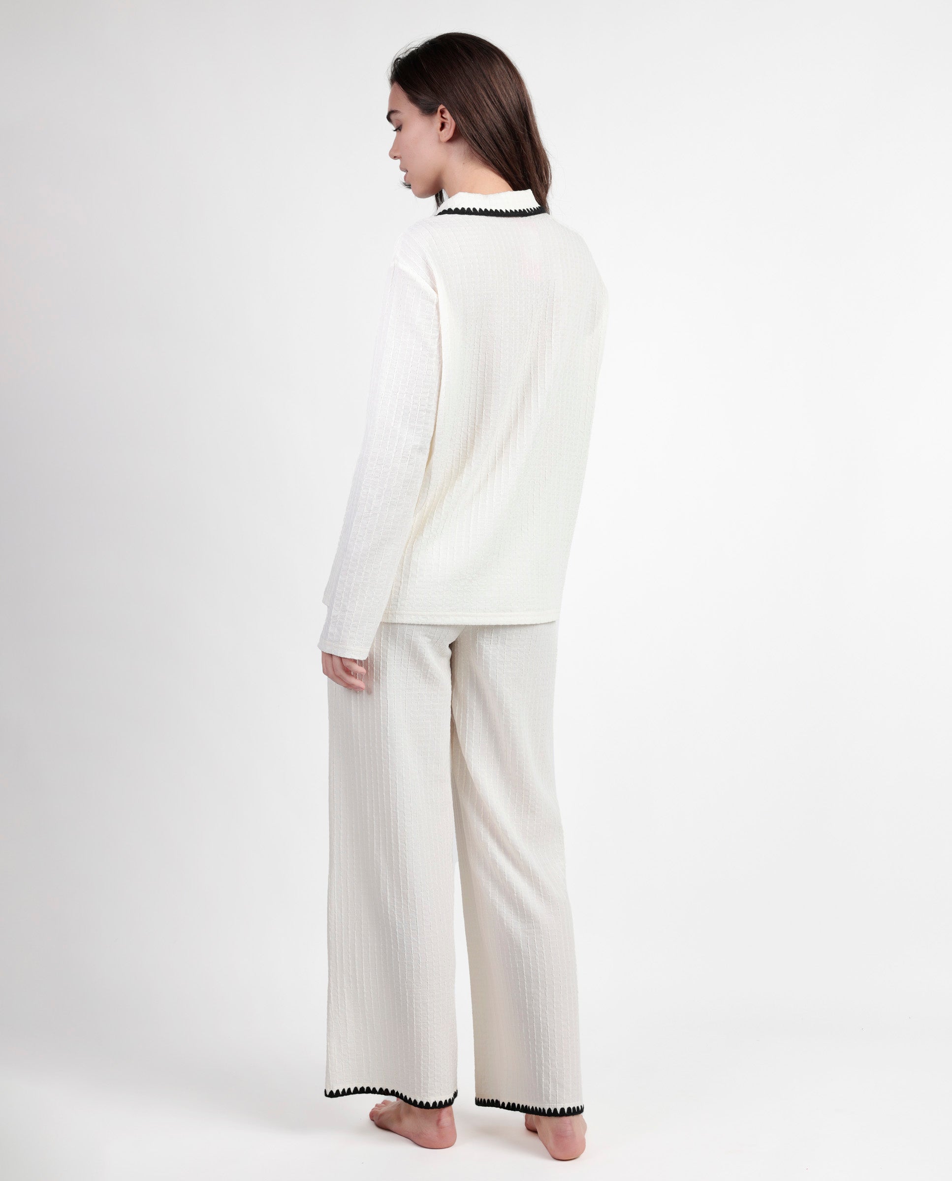 * Pijama abierto de tejido especial con textura, de manga larga, cuello de solapa y pantalón largo, en dos combinaciones de color: crudo y negro.