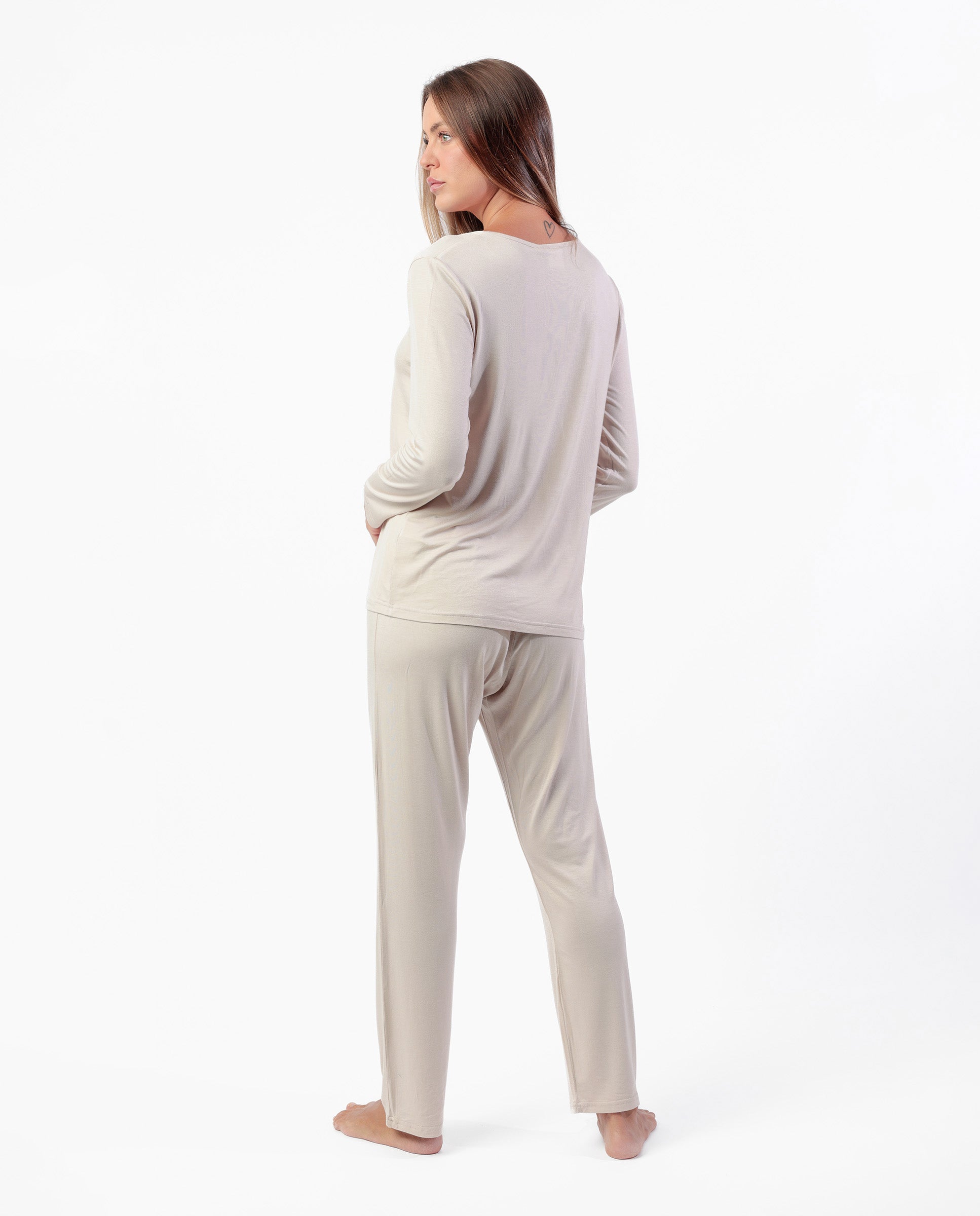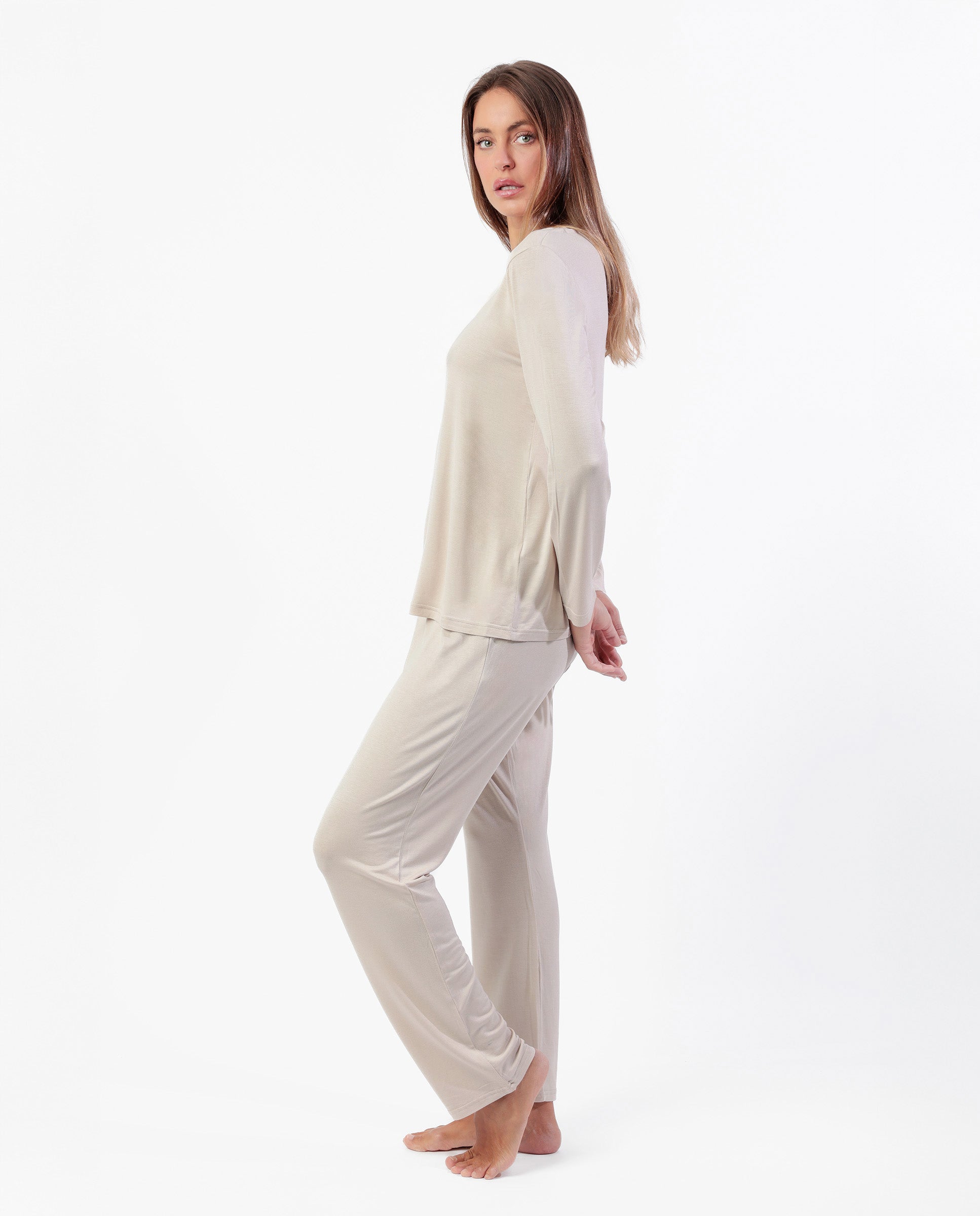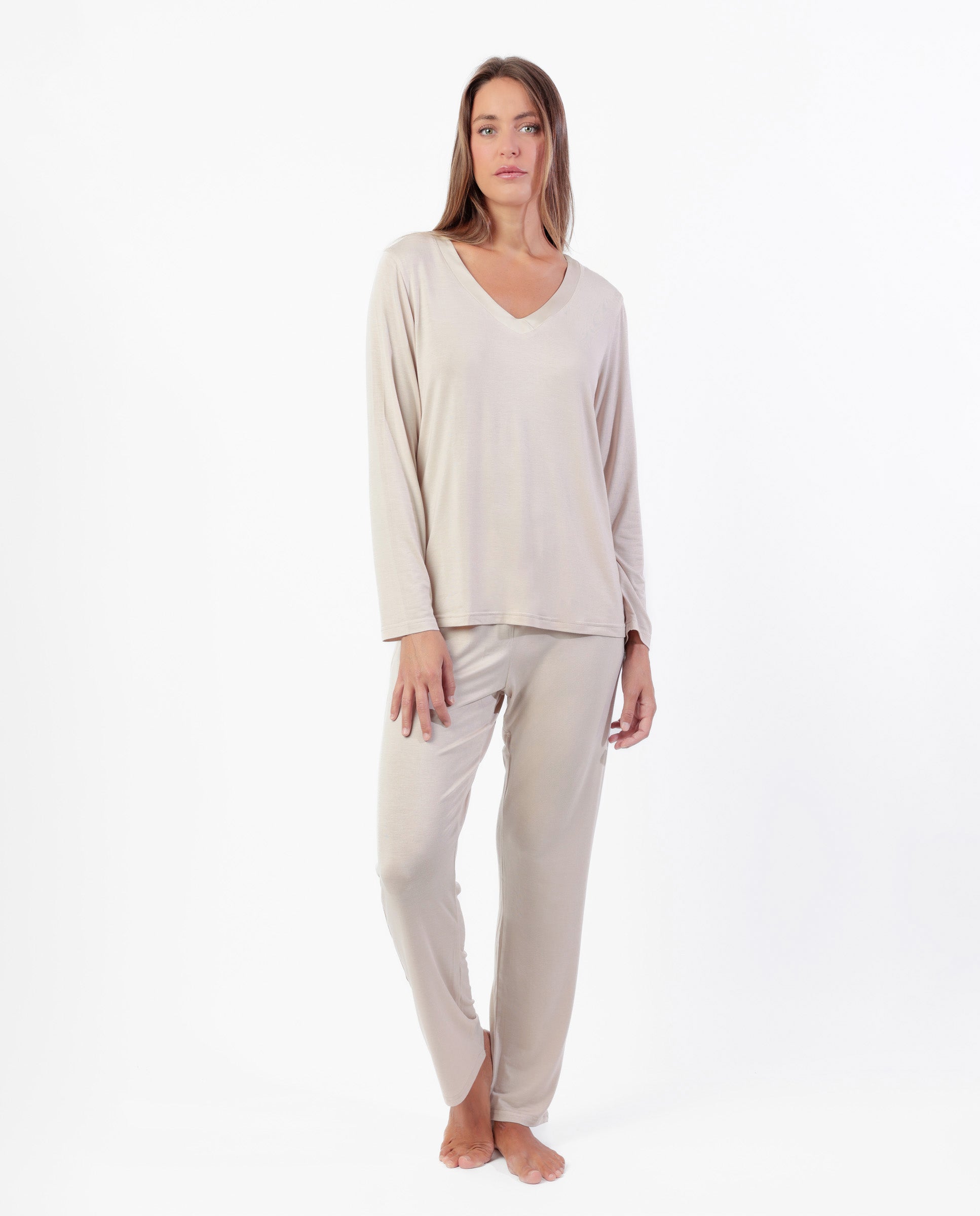 * Pijama de punto modal, de manga larga, cuello pico y pantalón largo, en tres combinaciones de color: cava, negro y cobre.