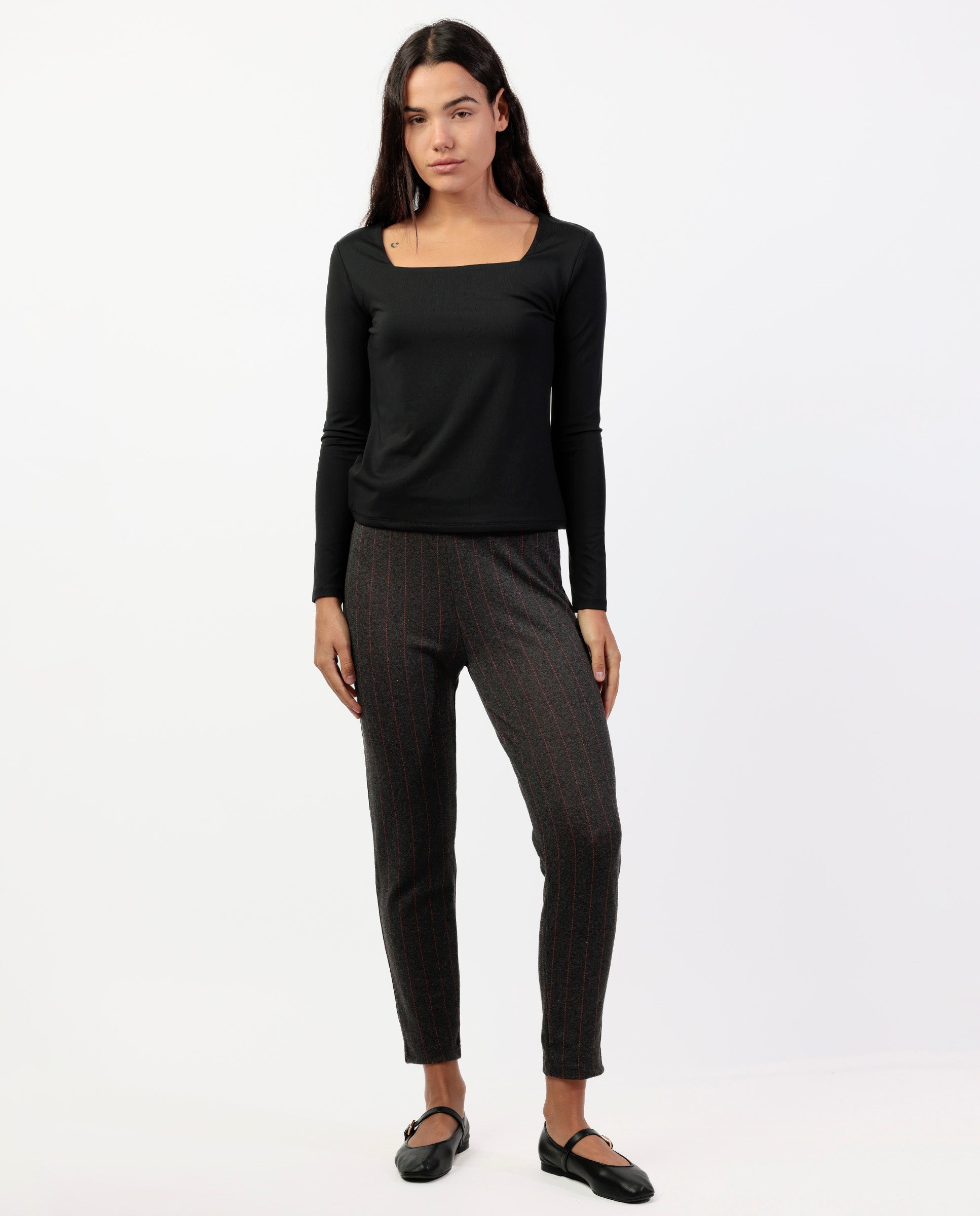 * Pantalón largo, de punto elástico estampado de rayas, disponible en color gris jaspe.