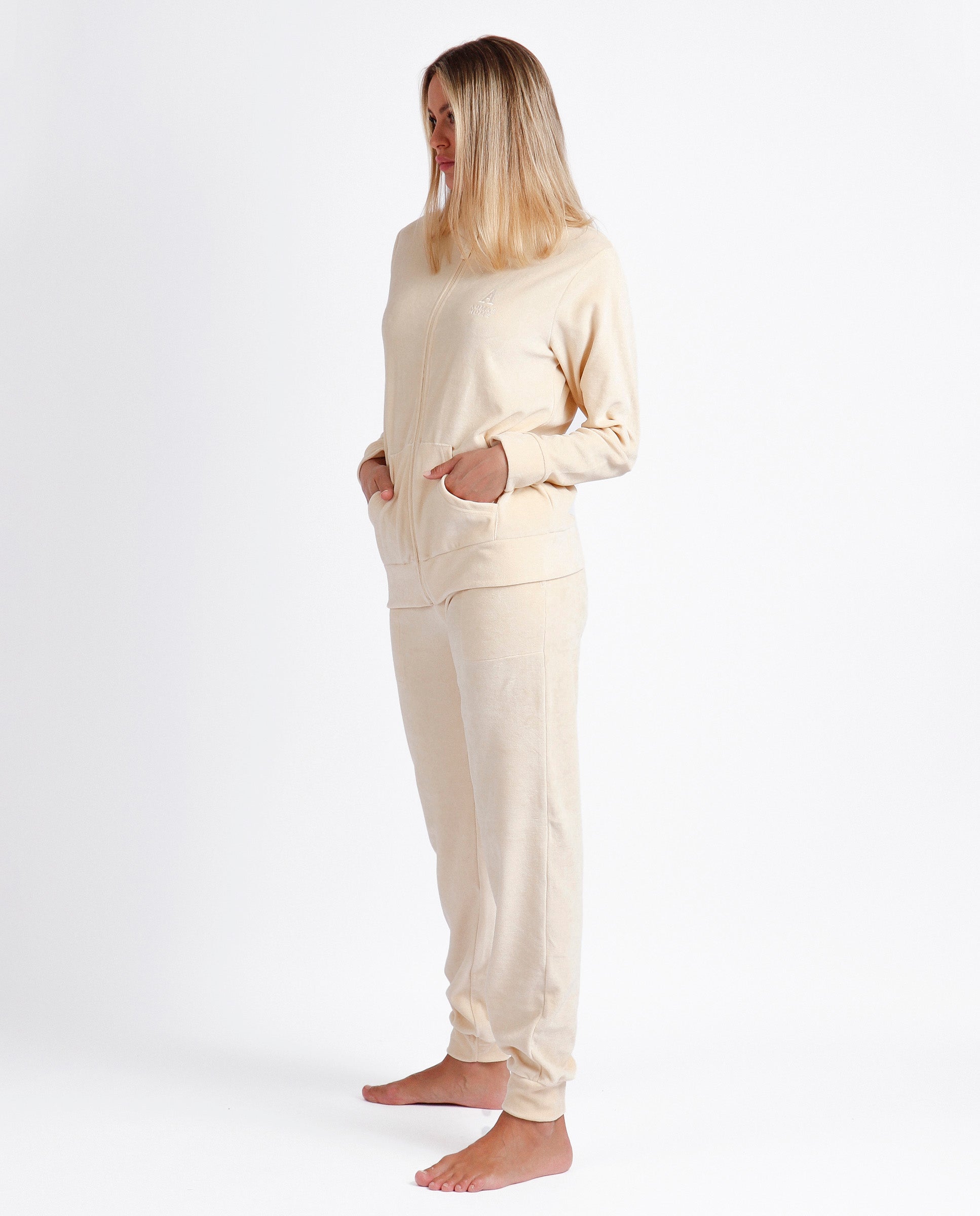 * Pijama abierto de tejido especial ultraelástico de terciopelo con lycra, de manga larga y pantalón largo, en dos combinaciones de color: hielo y pétalo.