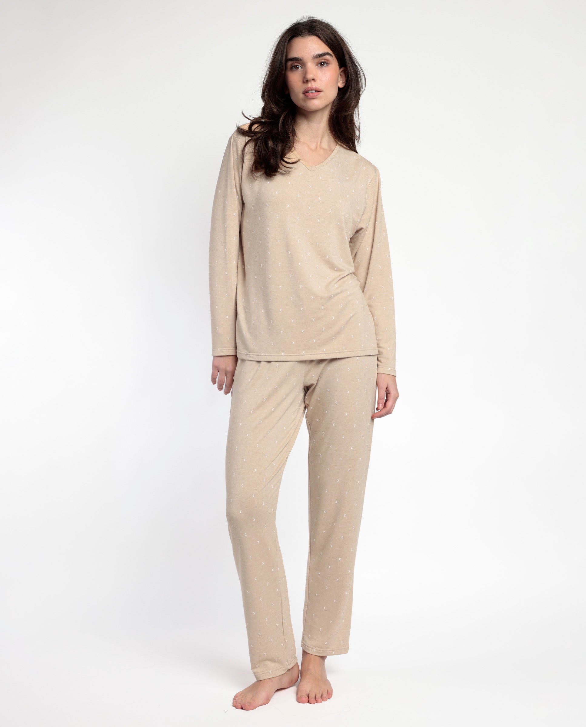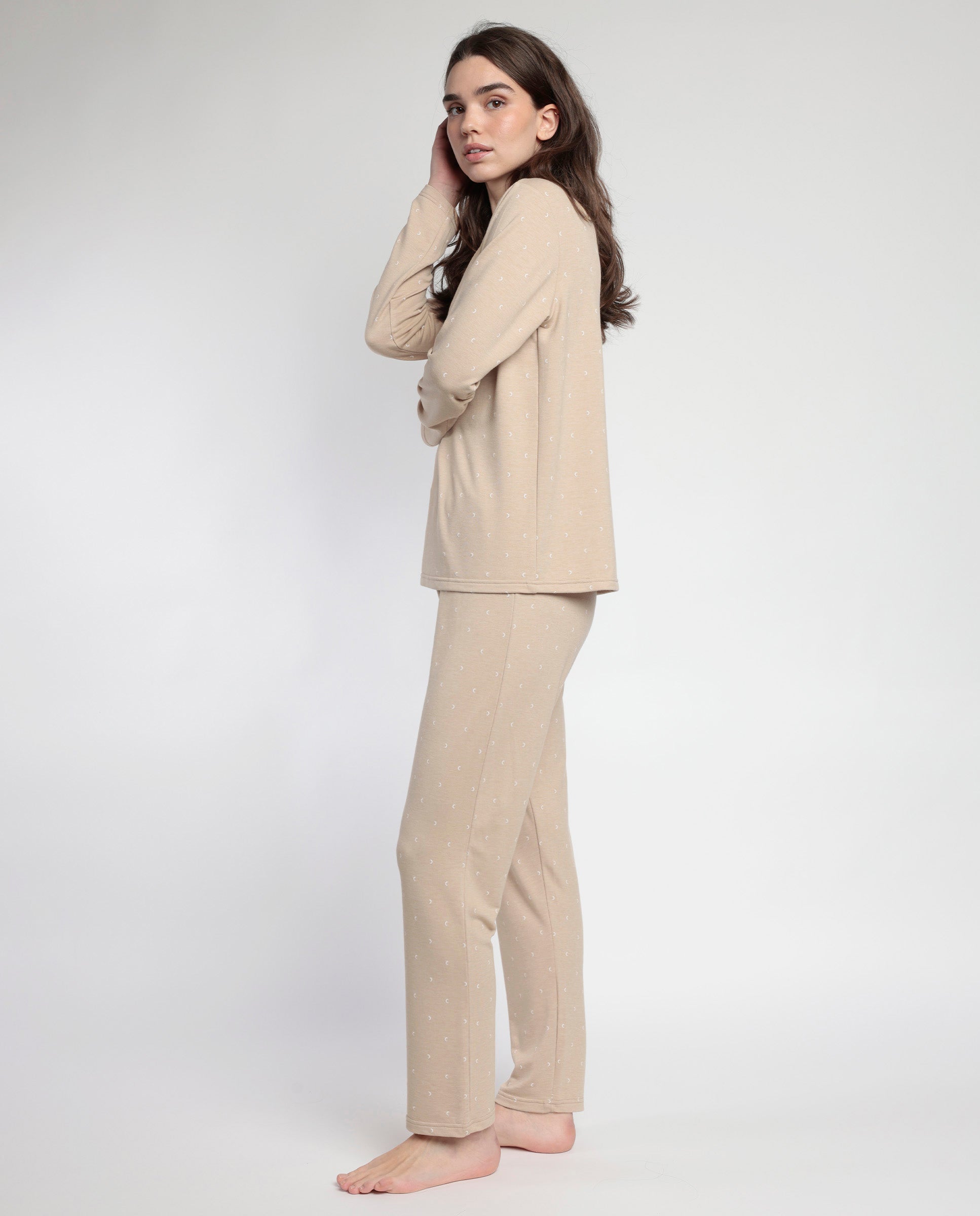 Pijama Beige Manga Larga Pico Moons para Mujer