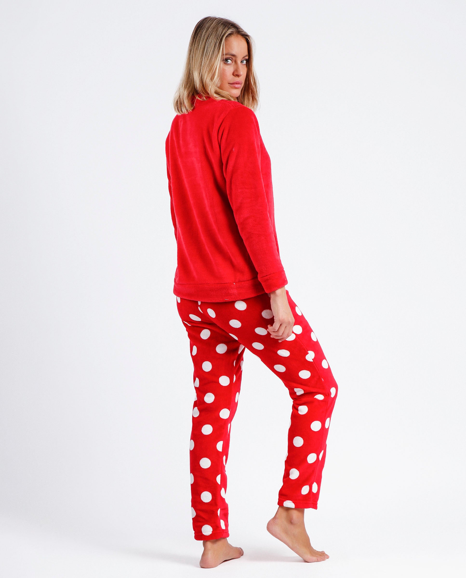 SANTORO GORJUSSPijama de tejido calentito grueso de corel, de manga larga, cuello redondo y pantalón largo.La camiseta es de color frambuesa, con aplique bordado, personalizada de la marca Santoro. El Pantalón tejido calentito grueso corel, con cinturilla ajustable. El tejido es muy suave al tacto. .