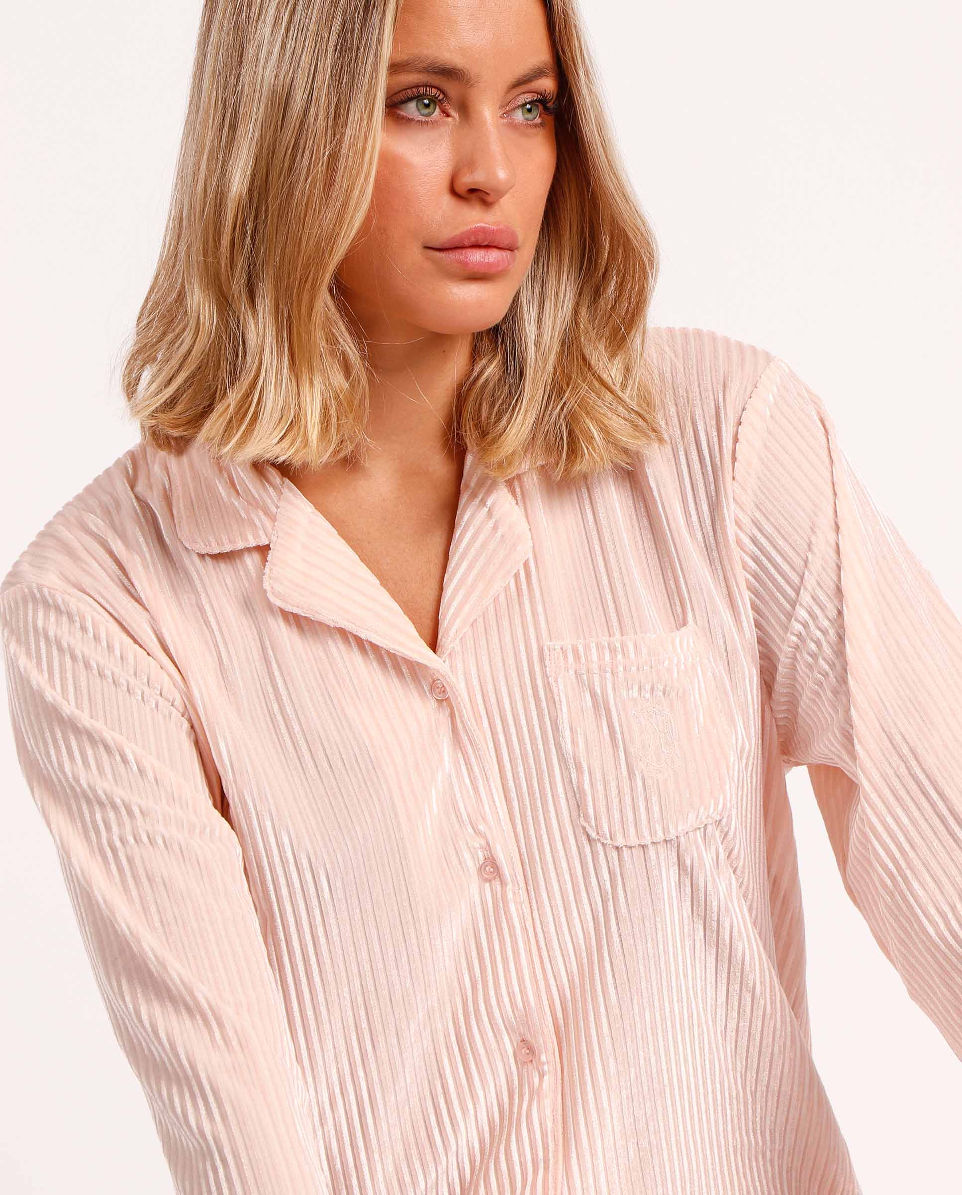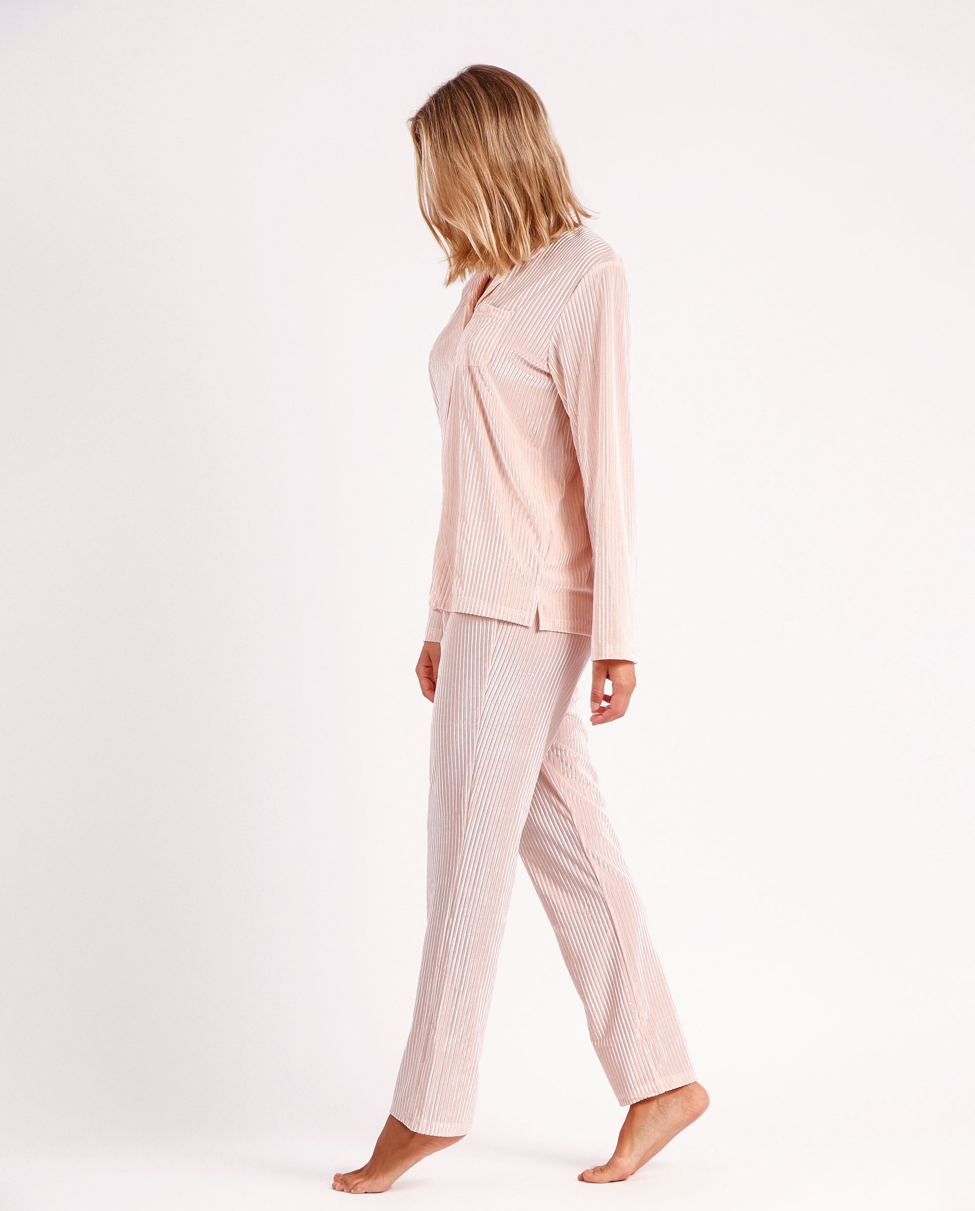 * Pijama abierto de tejido de terciopelo rayas, de manga larga y pantalón largo, en tres combinaciones de color: gris, rosa y negro.