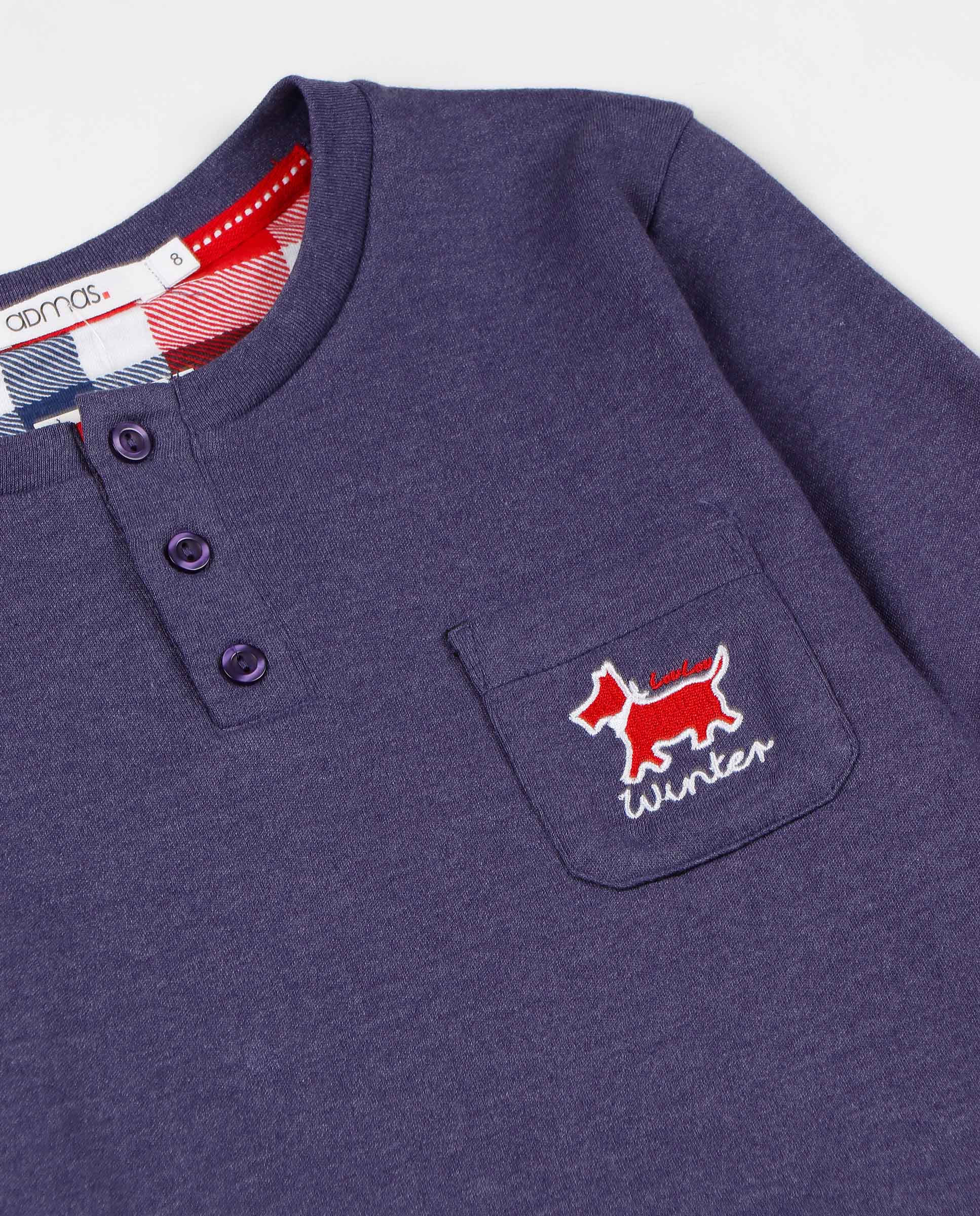 * Pijama de punto de algodón, de manga larga, cuello con tapeta con botones y pantalón largo.